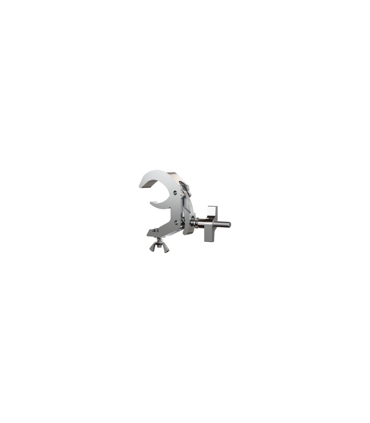 Clamp in alluminio per Truss, concepito per permettere ad una sola persona di fissare apparecchiature pesanti in totale sicurezza grazie al sistema di chiusura automatica a pressione.