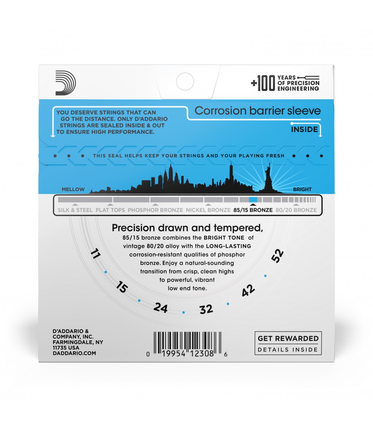 Il set 85/15 Bronze unisce la brillantezza del 80/20 Bronze con la caratteristica lunga vita delle Phosphor Bronze. Il filo in bronzo avvolge con precisione un'anima a forma esagonale in high carbon steel, che permette una lunga durata, un tono brillante e ottima intonazione.Le D'Addario EZ910 sono corde a scalatura ibrida, compromesso confortevole per i musicisti che vogliono la profondità delle basse, ma meno tensione sulle corde alte per bending facilitati.