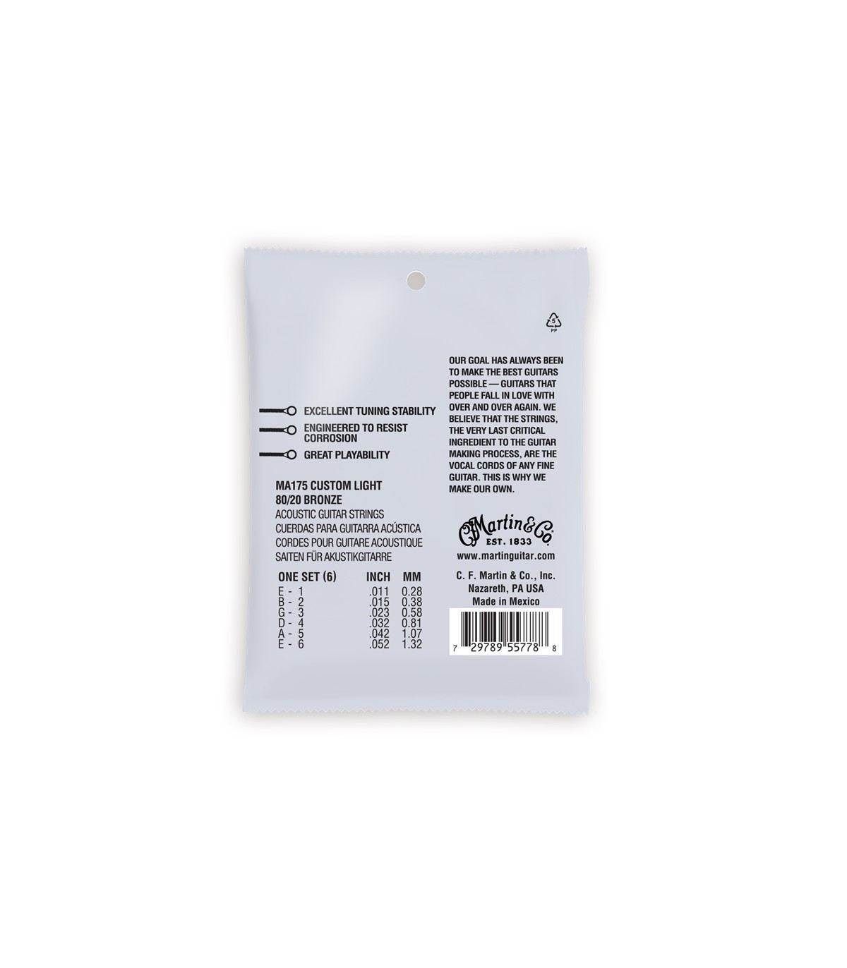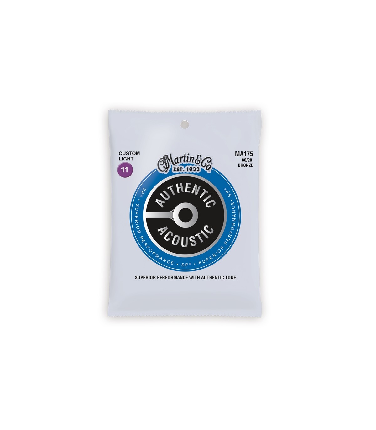 Le corde per chitarra acustica MA175 di Martin & Co della serie Authentic Acoustic SP® sono composte da un avvolgimento in Bronzo 80/20 di alta qualità su filo ultra resistente alla trazione e alla corrosione. Offrono un timbro genuino ed equilibrato, stabililità di accordatura e grande suonabilità. MA175 in scalatura Custom Light presentano i seguenti diametri: 11-15-23-32-42-52