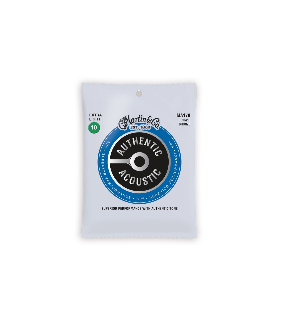 Le corde per chitarra acustica MA170 di Martin & Co della serie Authentic Acoustic SP® sono composte da un avvolgimento in Bronzo 80/20 di alta qualità su filo ultra resistente alla trazione e alla corrosione. Offrono un timbro genuino ed equilibrato, stabililità di accordatura e grande suonabilità. MA170 in scalatura Extra Light presentano i seguenti diametri: 10-14-23-30-39-47