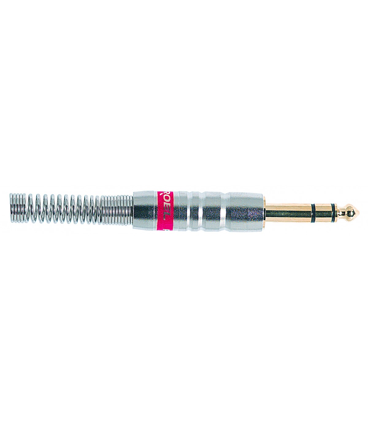 Jack stereo Ø 6.3 mm.- 1/4' professionale, contatti dorati, manicotto in ottone nichelato argentato e molla passacavo flessibile Ø 7.3 mm.