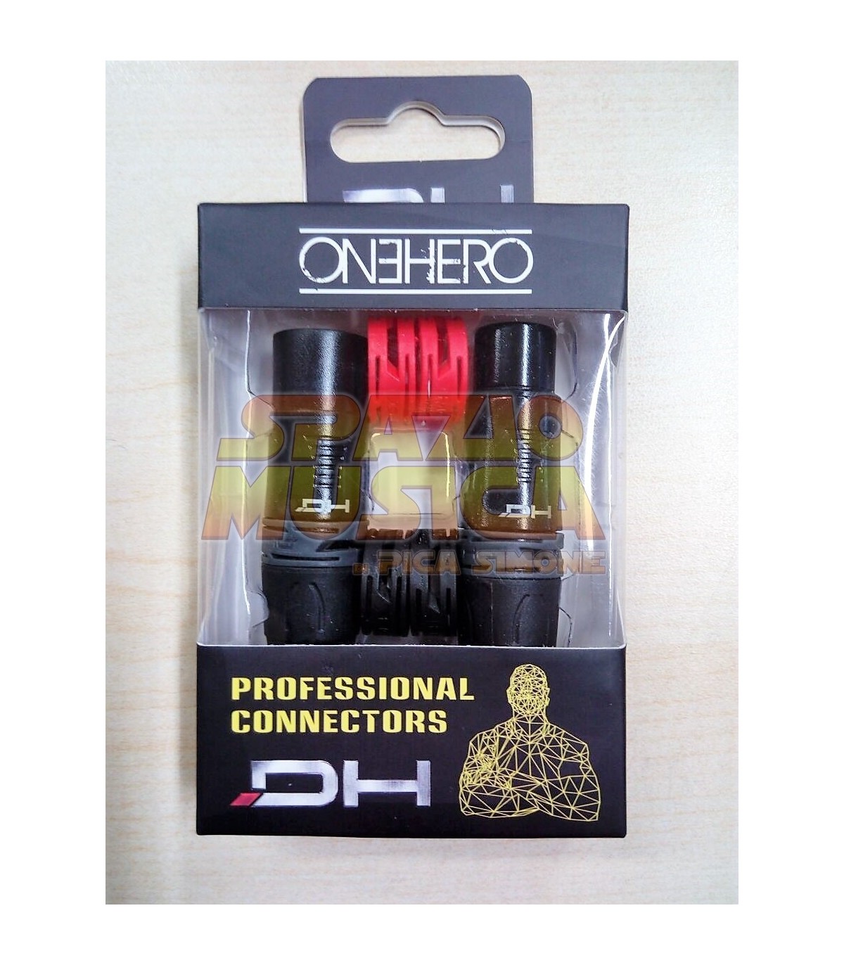 Coppia connettore professionale XLR 3 poli maschio volante ONEHERO / XLR 3 poli femmina. Dotato di robusto manicotto ergonomico realizzato in pressofusione di lega di zinco e speciali contatti di dimensioni maggiorate per incrementare la conduttivit ed evitare il movimento durante la connessione. Guscio posteriore in nylon rinforzato e passacavo in PVC per garantire una eccellente protezione del cavo. Speciale pinza interna per un semplice ed ottimale serraggio, adatta a ricevere cavi da 3 a 7 mm di diametro.