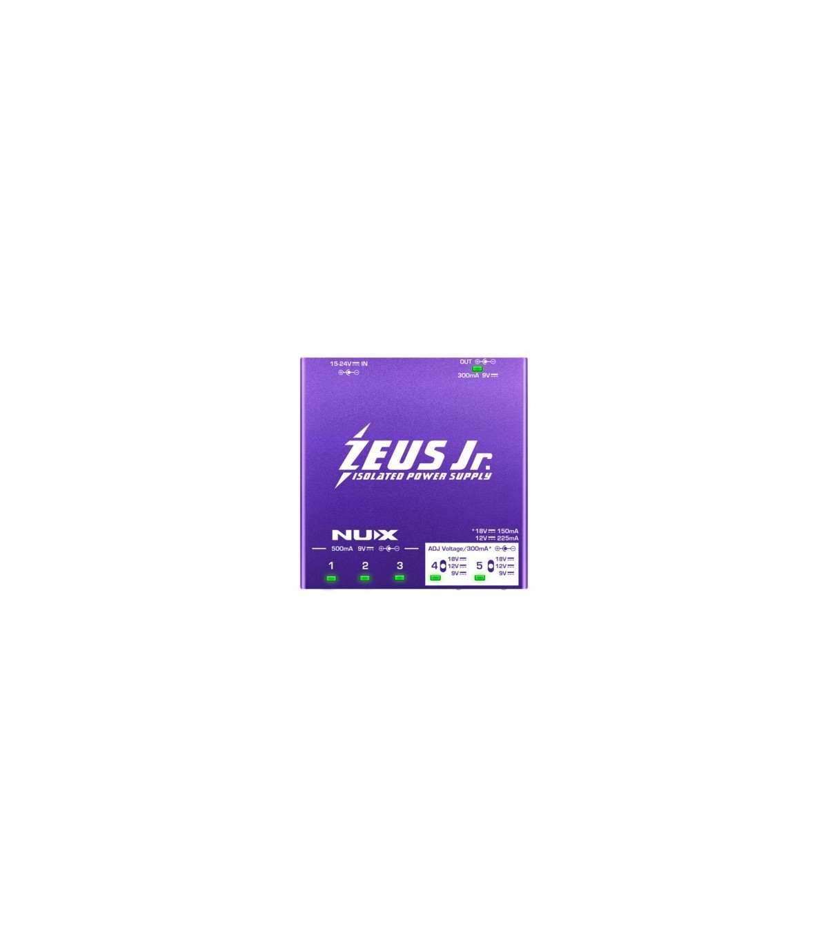 ZEUS Jr. è un alimentatore affidabile, estremamente silenzioso, leggero, universale, ad alta corrente e completamente isolato, che fornisce 6 uscite di alimentazione CC isolate ad alta corrente. Sono inclusi 6 trasformatori di alimentazione switching isolati, che offrono una fonte di alimentazione pulita e stabile per i pedali. ZEUS Jr. è dotato di 4 uscite (9V/500mA*3 | 9V/300mA*1) e di 2 uscite regolabili ad alta tensione (9V/300mA | 12v/225mA | 18v/150mA). Questo vi permette di utilizzare il vostro Fuzz o Phaser preferito con l'uscita regolabile per trovare il suono migliore.