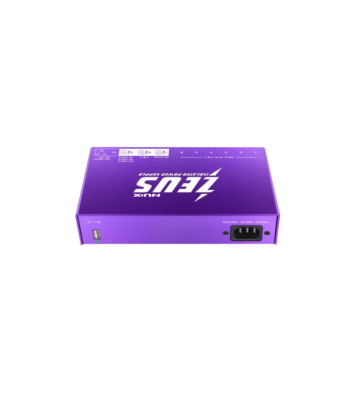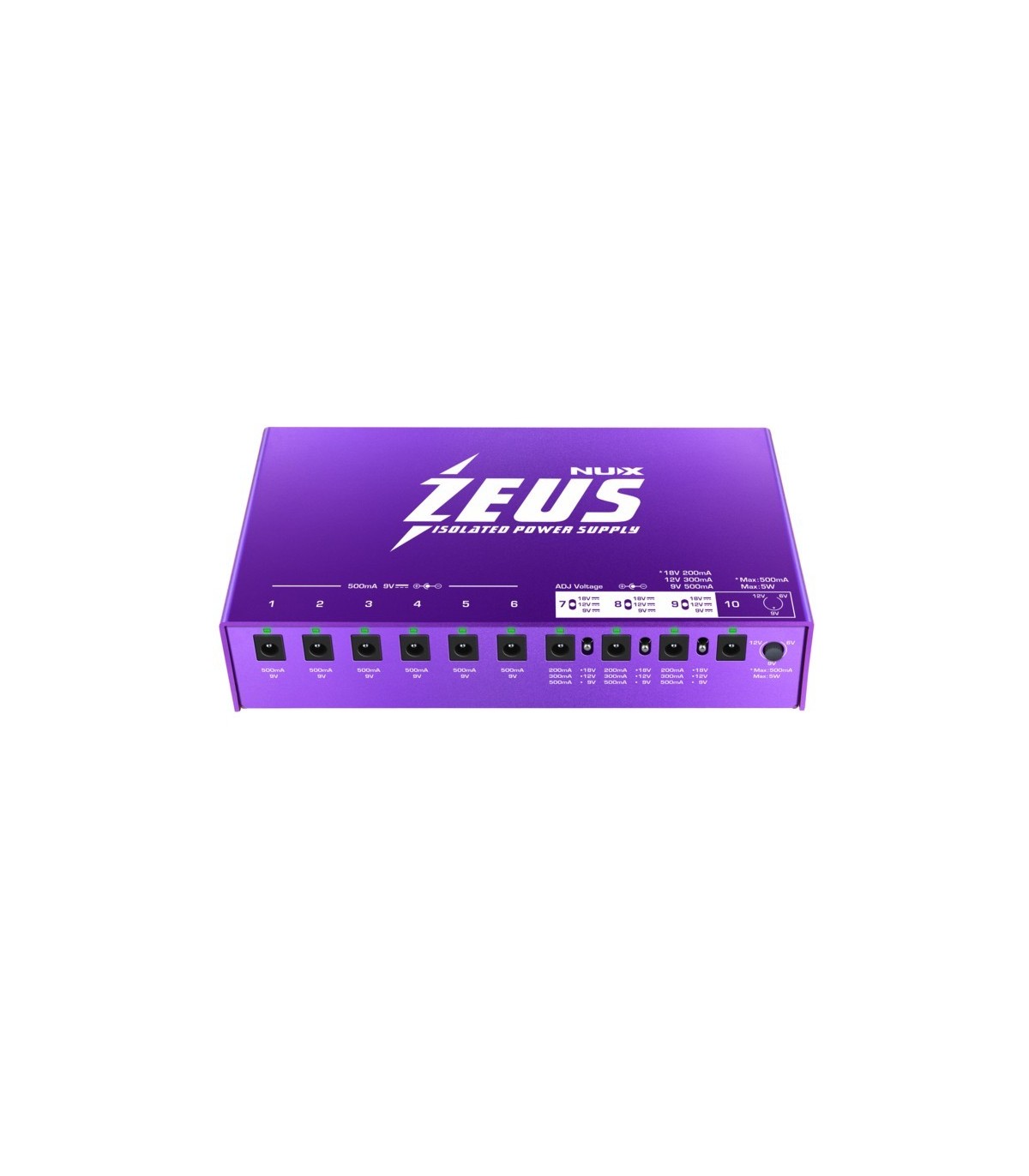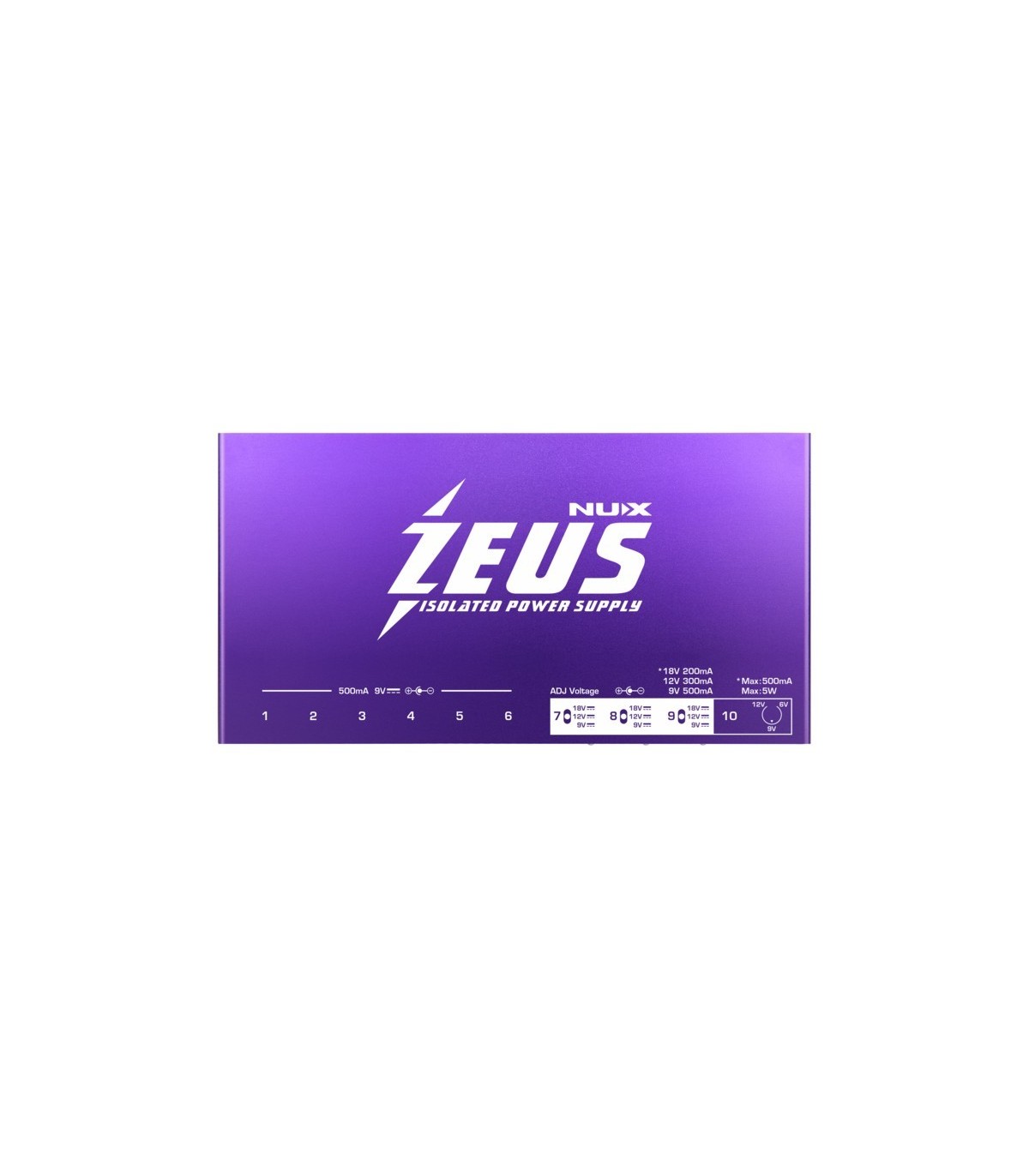 ZEUS è un alimentatore affidabile, silenzioso, leggero, universale, ad alta potenza e completamente isolato, concepito da NUX per dare ai musicisti la soluzione definitiva per catene di pedali prive di ronzio. ZEUS dispone di 10 alimentatori CC isolati ad alta potenza. È dotato di 10 trasformatori di alimentazione switching isolati per offrire una sorgente pulita e stabile ai vostri pedali. I chitarristi moderni amano gli effetti digitali, per questo ZEUS ha 3 uscite regolabili (9v/500ma | 12v/300ma | 18v/200ma) e 1 uscita modificabile (6v~9v~12v). Zeus è in grado di erogare una corrente sostanzialmente maggiore gestendo una gamma molto più ampia di tensioni di ingresso, più efficiente rispetto agli alimentatori lineari. Per i musicisti che affrontano concerti e tour, Zeus dispone di una porta USB per la ricarica dei dispositivi mobili. L'alimentazione CA universale di Zeus consente di lavorare in tutto il mondo senza alcun errore di corrente alternata.
