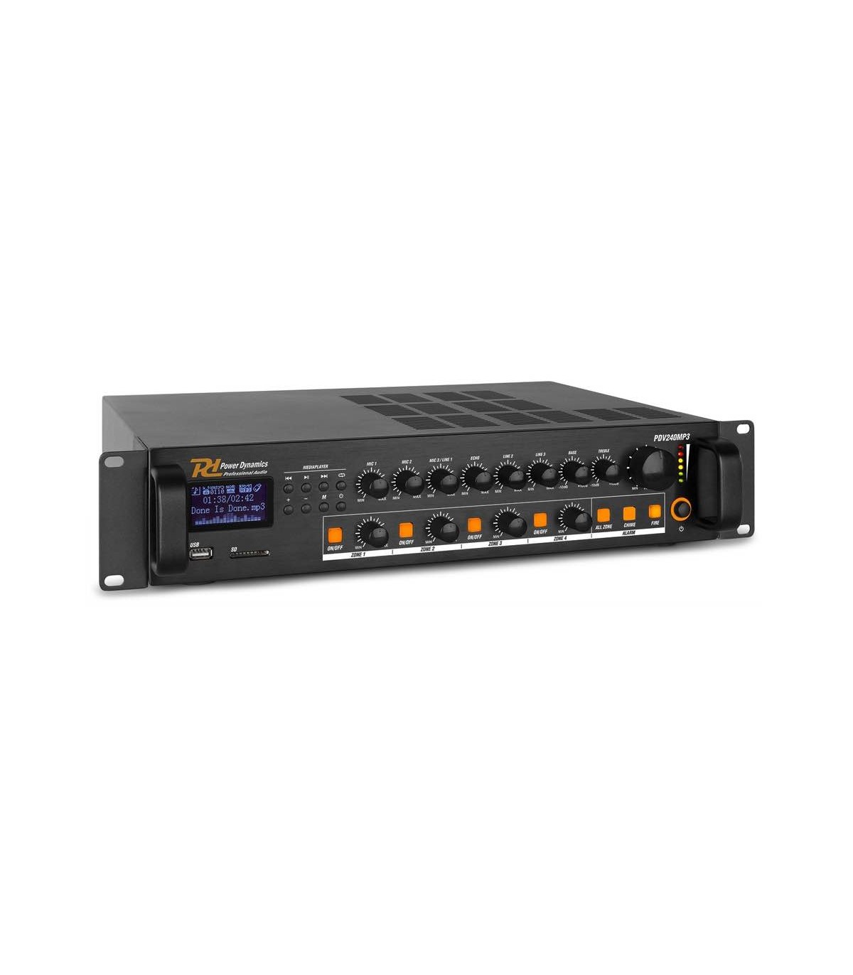 La serie PDV è una gamma di amplificatori ad alta potenza completa di tutte le funzionalità, con 4 uscite di zona, ciascuna con controlli di volume separati in 6 fasi. Questa serie di amplificatori presenta un modulo MP3 integrato con USB e SD Card, un sintonizzatore FM e un ricevitore BT interno. Il canale Mic 1 ha la priorità su tutti gli ingressi e sul lettore MP3. Dei contatti da 24 V possono essere collegati a un pannello di allarme antincendio per l'evacuazione di emergenza, se necessario. Tutti i modelli sono protetti da una protezione completa da sovraccarico per evitare danneggiamenti. Questa serie di amplificatori è adatta per installazioni in banche, municipi, supermercati, scuole, hotel, ristoranti, centri commerciali e qualsiasi altro spazio pubblico.