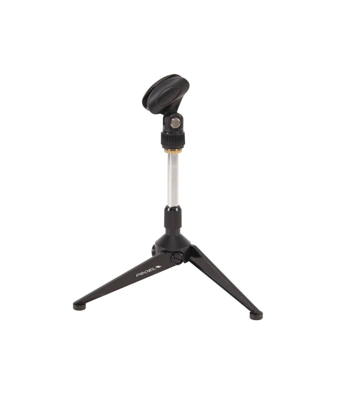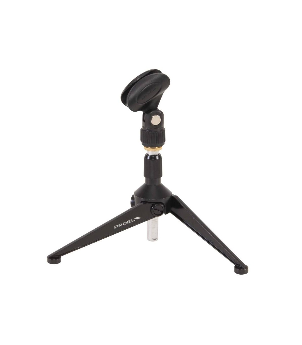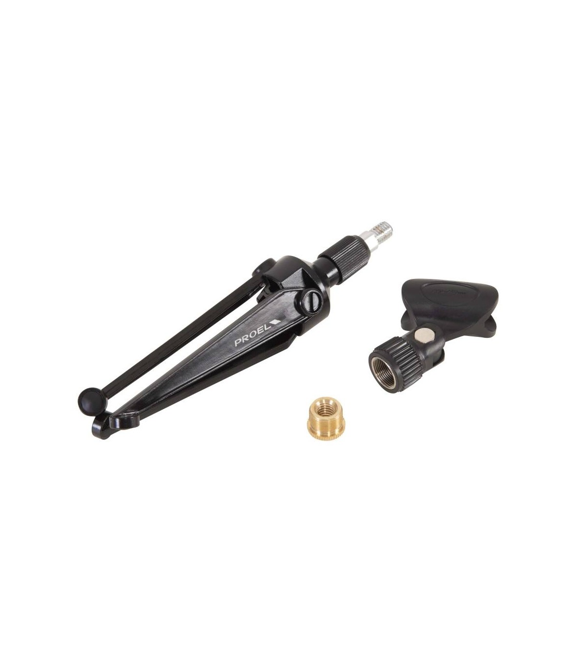 Base/supporto in metallo per microfono da tavolo completamente richiudibile fornito con supporto per microfono in ABS e adattatore universale. Disponibile in nero opaco.