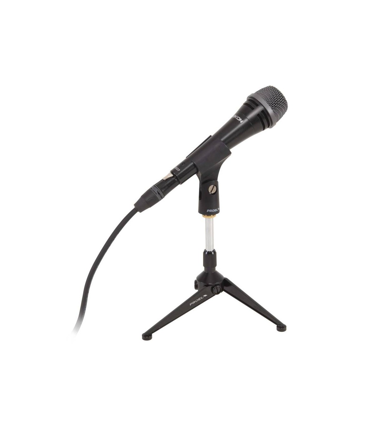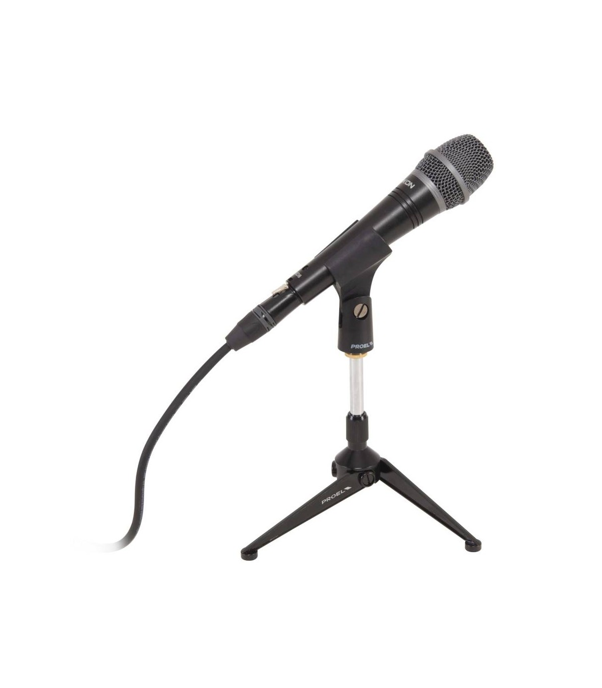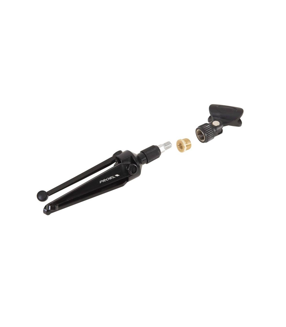 Base/supporto in metallo per microfono da tavolo completamente richiudibile fornito con supporto per microfono in ABS e adattatore universale. Disponibile in nero opaco.