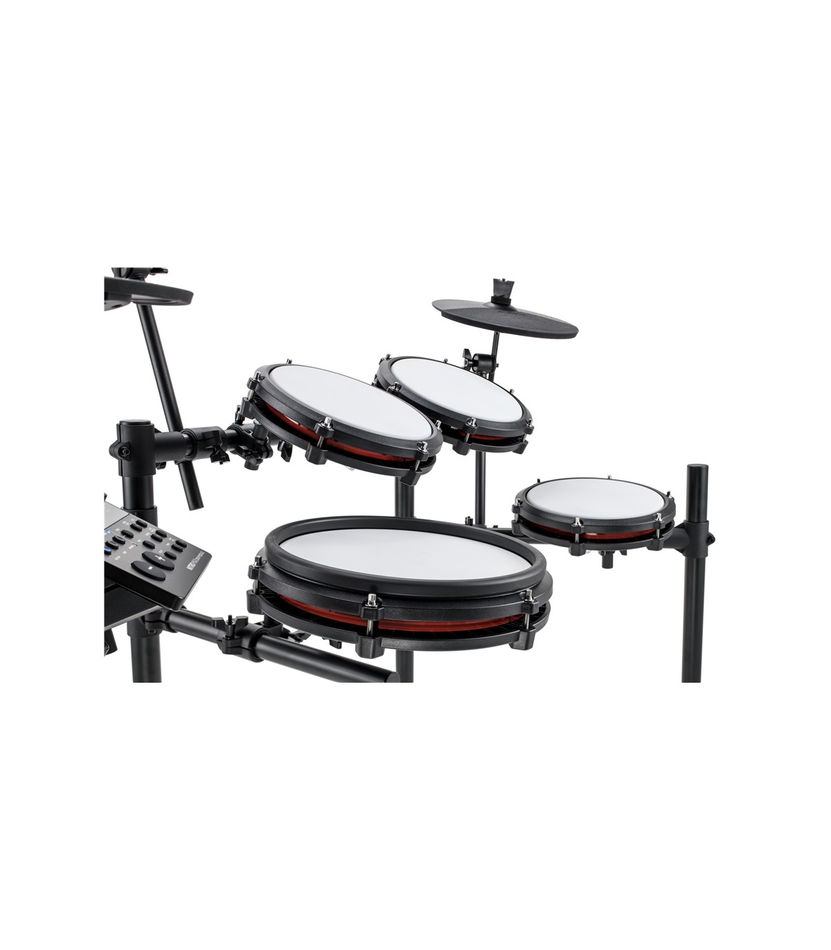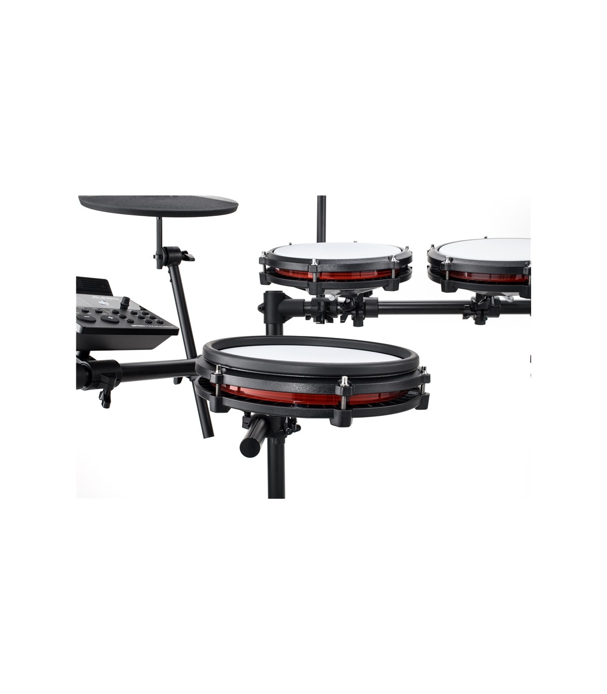 Con le pelli a rete premium a trama fitta di Nitro Max, non c'è bisogno di preoccuparsi che le sessioni di pratica notturne disturbino i vicini o i membri della famiglia, non importa con quanta energia tu suoni. Il kit è dotato di un pad per rullante da 10” a doppia zona e di tre pad per tom da 8” tutti a singola zona e di un pad della grancassa di tipo verticale anch’esso con un'ampia superficie da 8”. Per quanto riguarda i pad dei piatti troviamo un crash da 10" con funzione choke, un ride da 10" e un charleston da 10”.