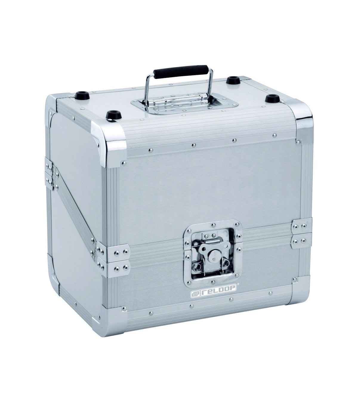 Valigia professionale per il trasporto di 40+40 vinili in due compartimenti separati e con top obliquo rimovibile. Colore argento.