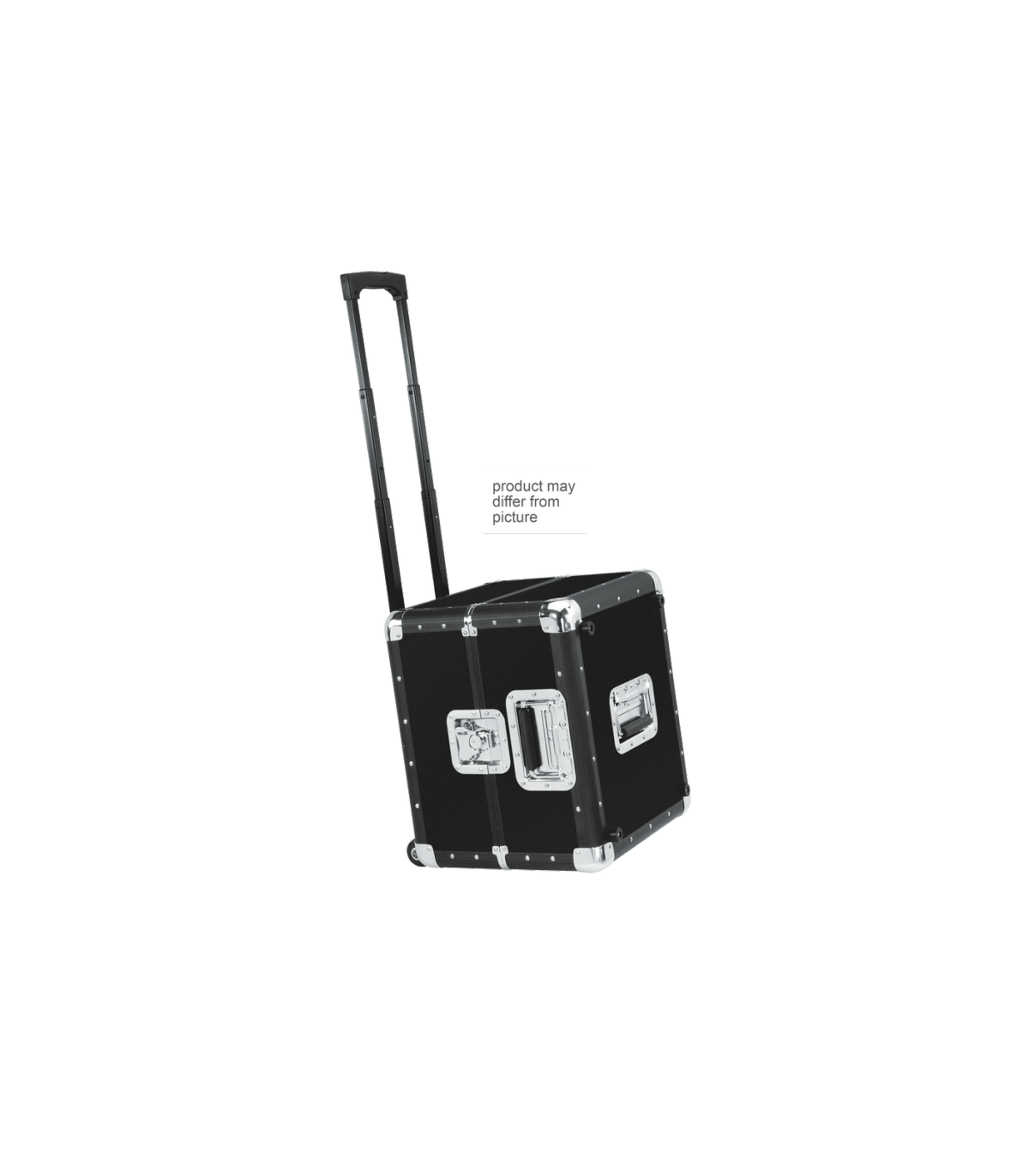 Trolley professionale per il trasporto di 120 vinili suddivisi in 2 compartimenti e con top rimovibile. Colore nero.