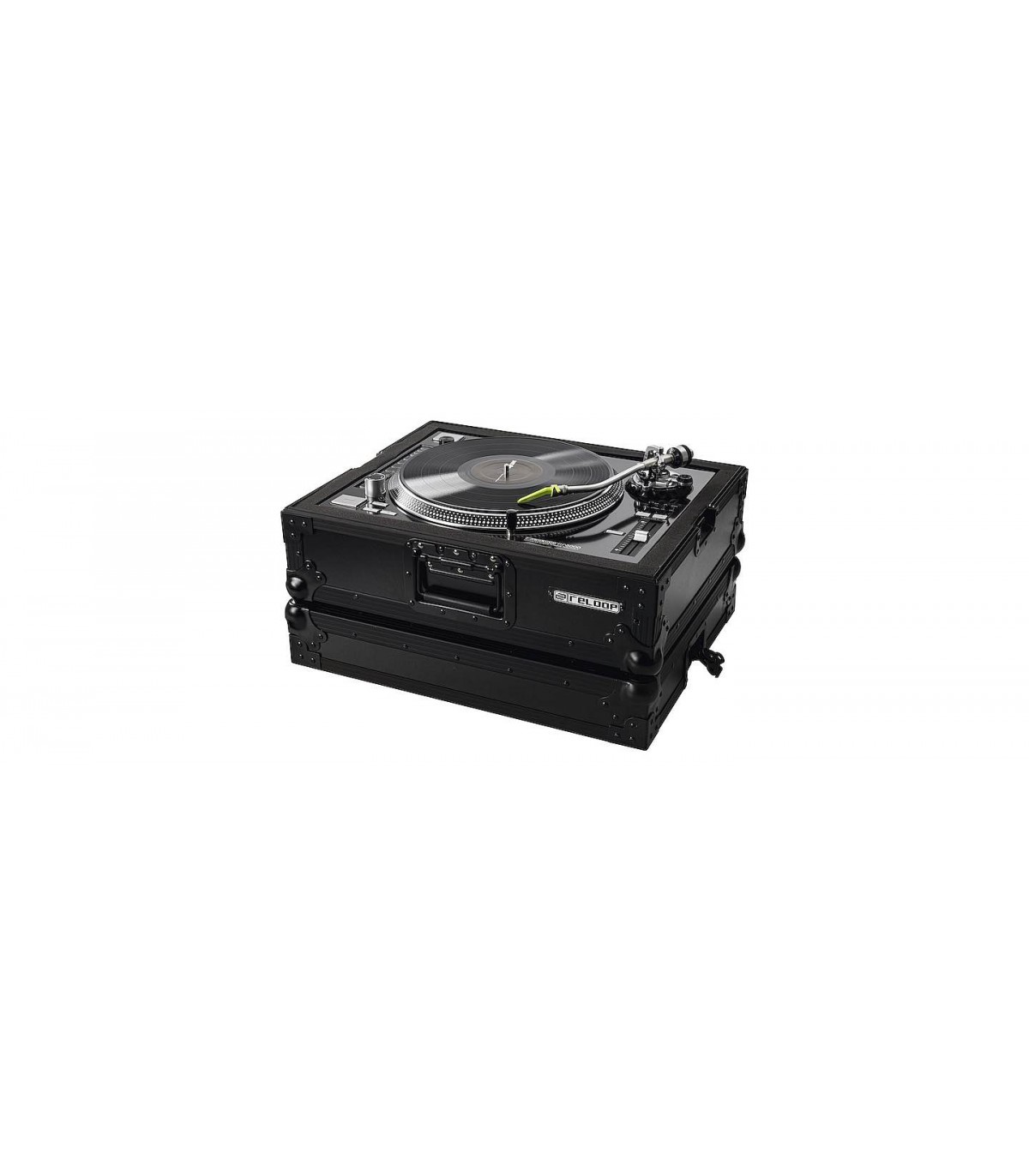 Robusto flight-case professionale in legno rivestito, per il trasporto di un giradischi, dotato di maniglia a scomparsa, angoli rinforzati, imbottitura interna, chiusure di sicurezza, foro per uscita cavi, dimensioni 528 x 240 x 429 mm, peso 8.5 kg.