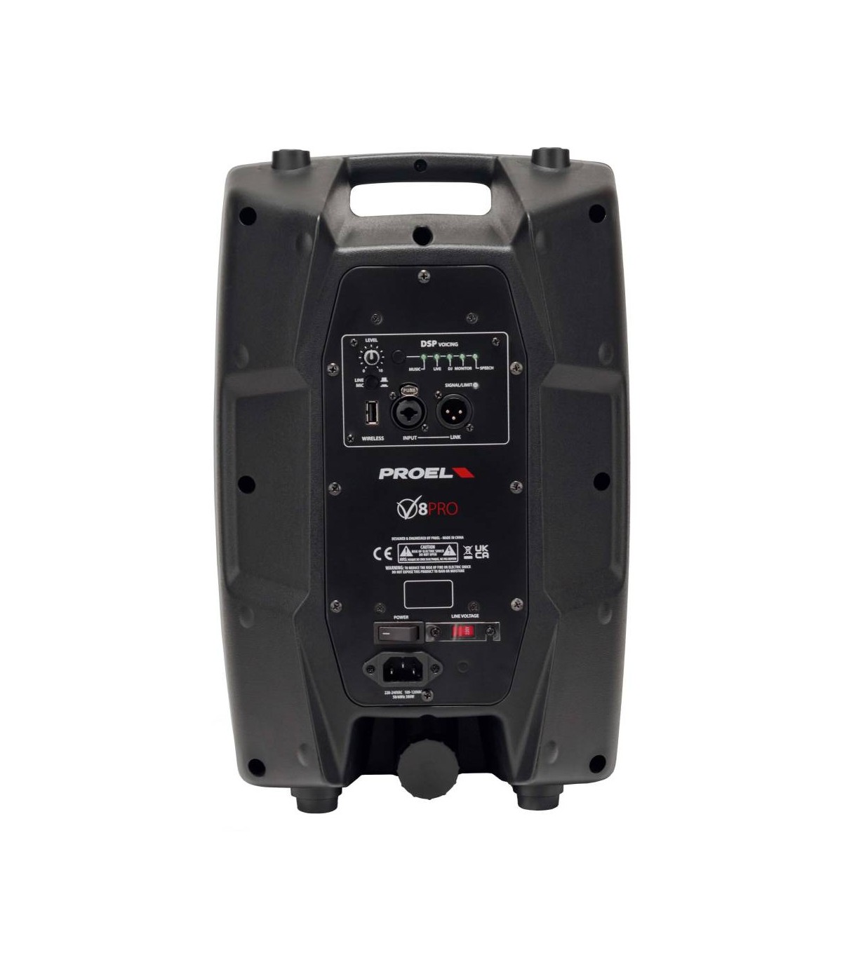 La serie V PRO è l'ultima evoluzione dell'acclamata serie V di altoparlanti amplificati PROEL. I diffusori V PRO offrono ora una sezione di pre-amplificazione totalmente nuova che include un’avanzata sezione DSP ad alte prestazioni per una risposta lineare e un suono ad alta definizione. La possibilità di selezionare 5 diversi preset di EQ permette di adattare la risposta del sistema alle diverse applicazioni con un semplice tocco delle dita. Questi diffusori ultraportatili combinano, in cabinet leggeri e accuratamente progettati, il suono PROEL più chiaro e definito con la tecnologia di amplificatore di classe D e l'alimentazione Switch Mode, offrendo una soluzione PA imbattibile al suo prezzo. I quattro modelli, V8PRO, V10PRO, V12PRO e V15PRO, sono dotati di un nuovo modulo amplificatore estremamente efficiente in grado di fornire 600 W di potenza ai trasduttori. Grazie all'utilizzo della tecnologia SMPS, questa potenza viene fornita in un package ultraleggero, rendendo V PRO gli altoparlanti PROEL più portatili di sempre.