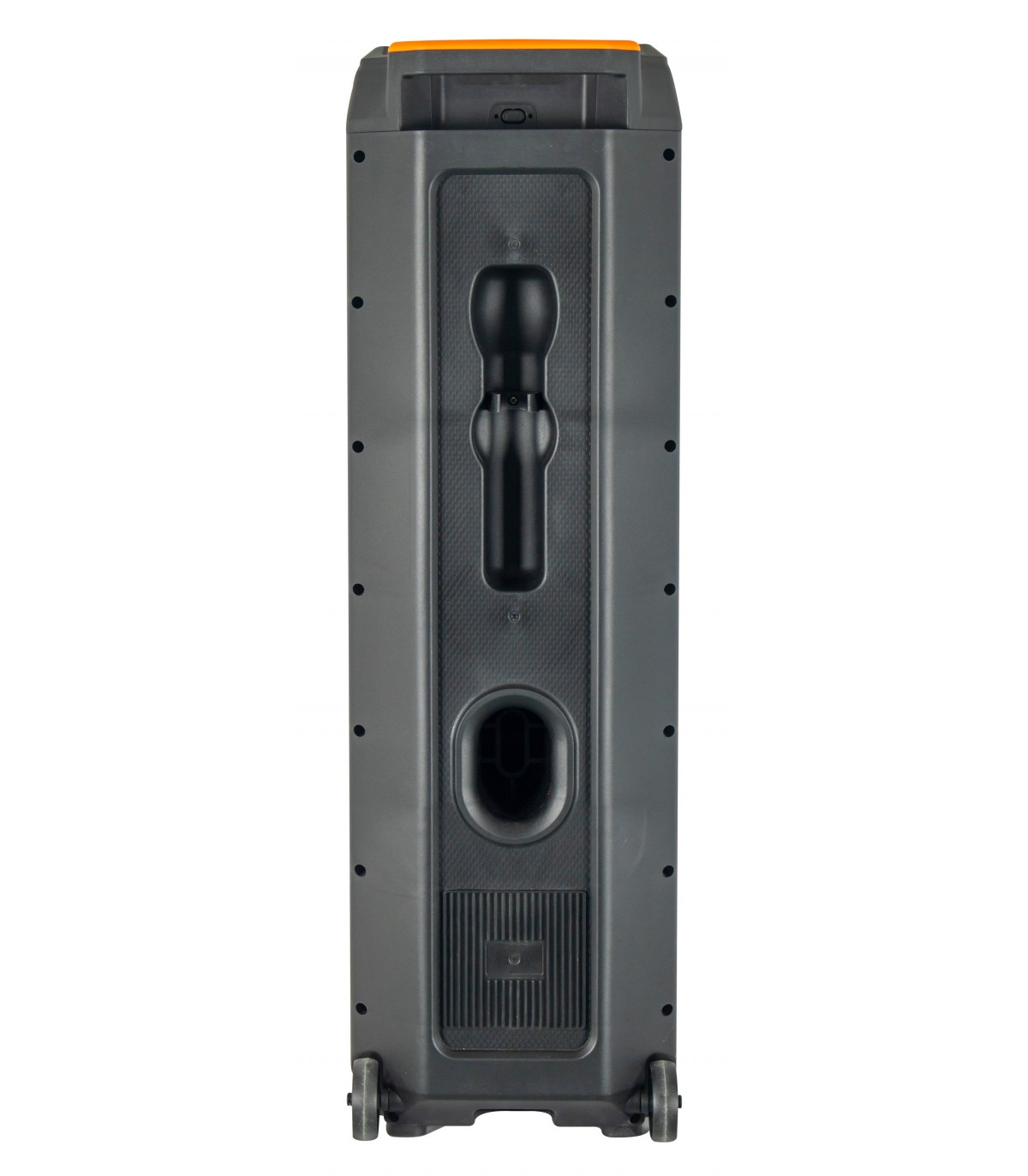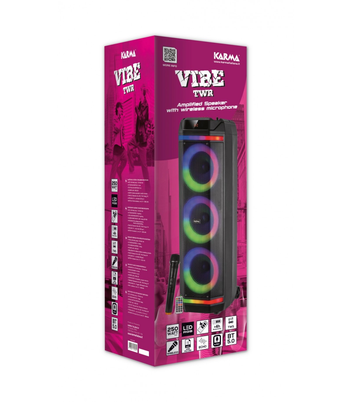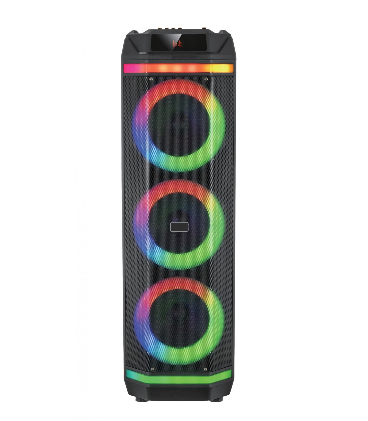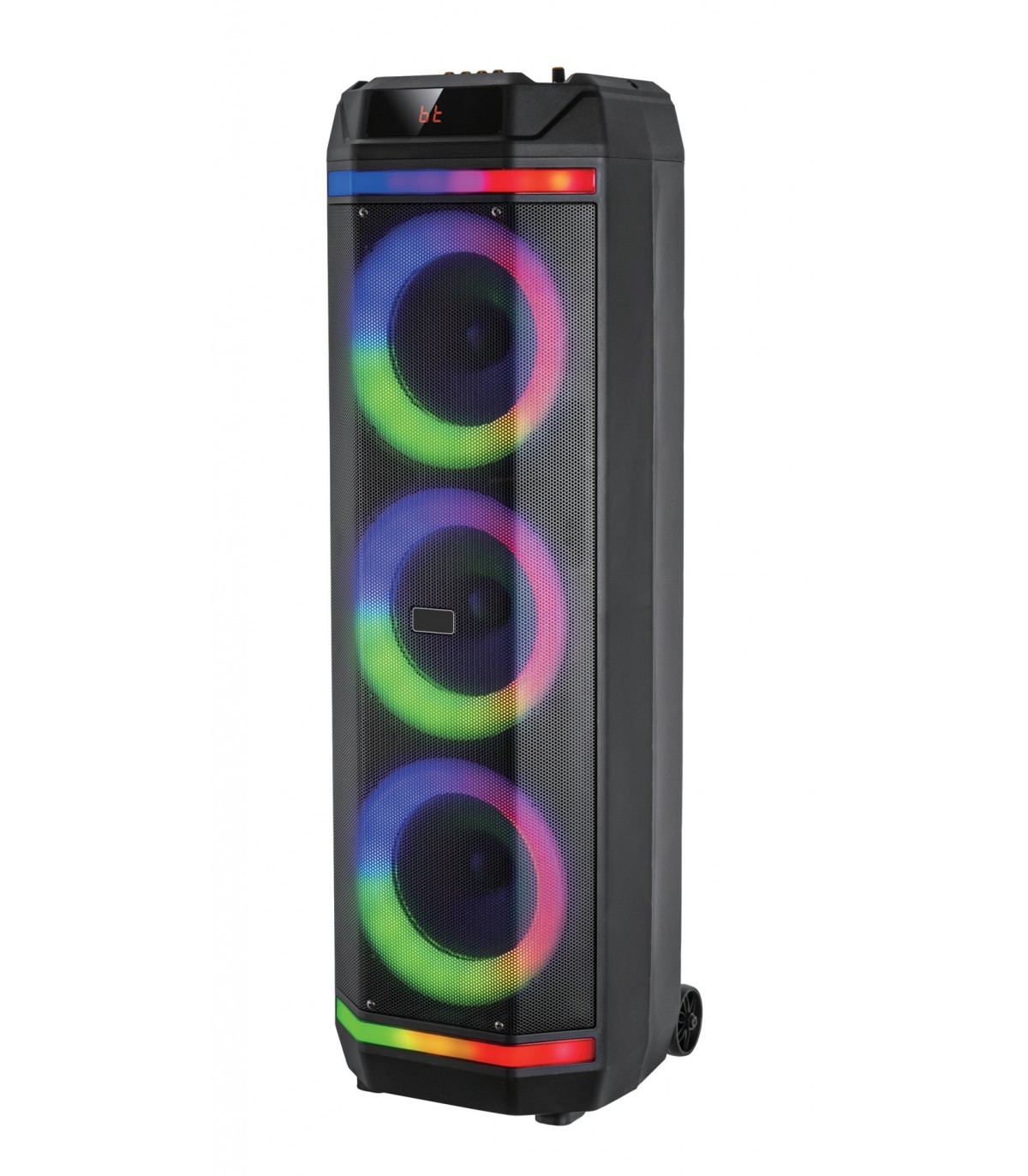 Party box con triplo woofer da 8" per una resa acustica unica. La parte frontale è illuminata in con vari effetti ma i led possono anche essere spenti. Il pannello di comando frontale offre tutte le regolazioni (toni alti, bassi, eco..). Incorpora un lettore Mp3 tramite microSD e USB. La ricevente bluetooth si collega allo smartphone per la riproduzione della propria musica. In confezione sono presenti un telecomando ad infrarossi e un pratico radiomicrofono.