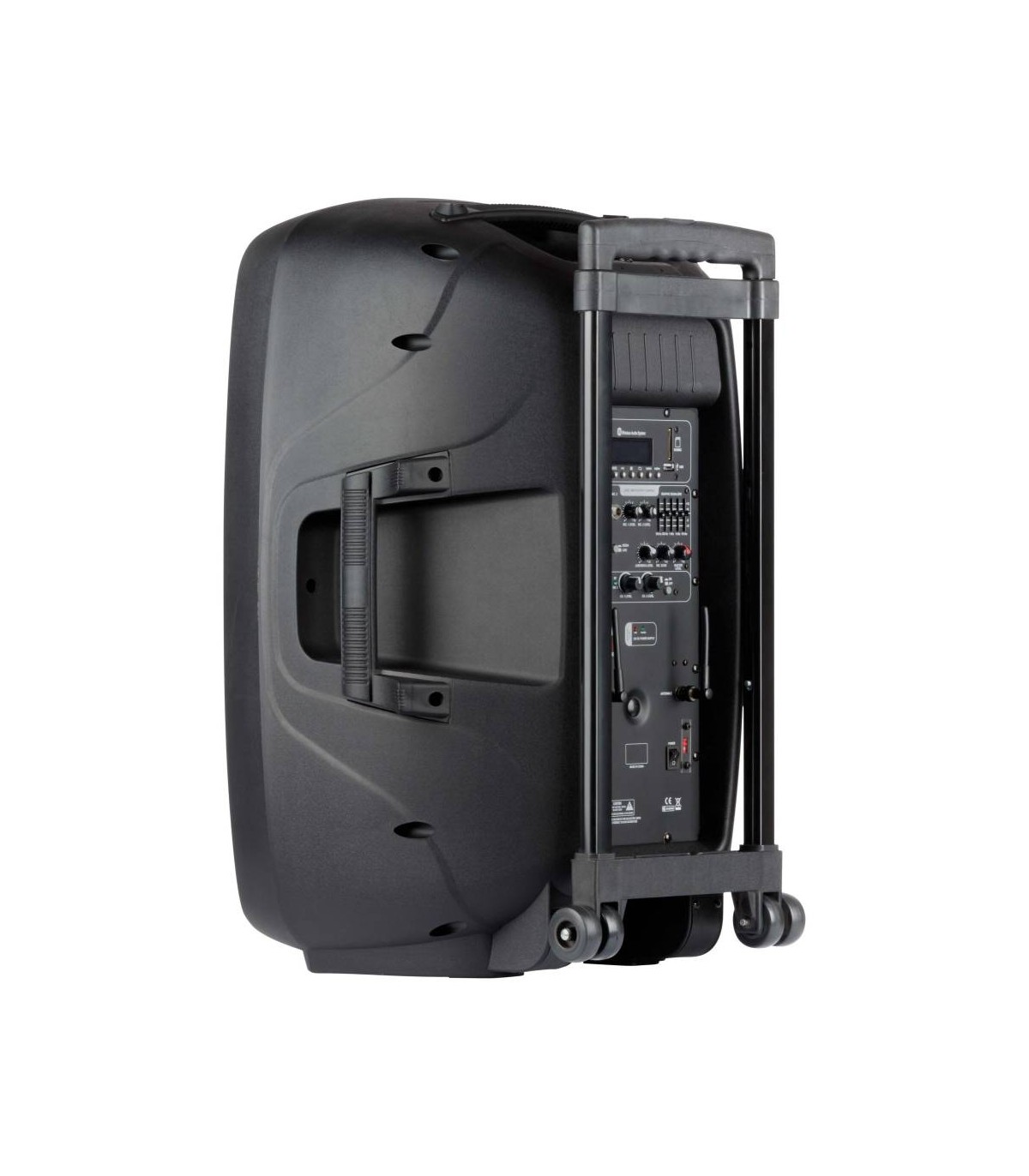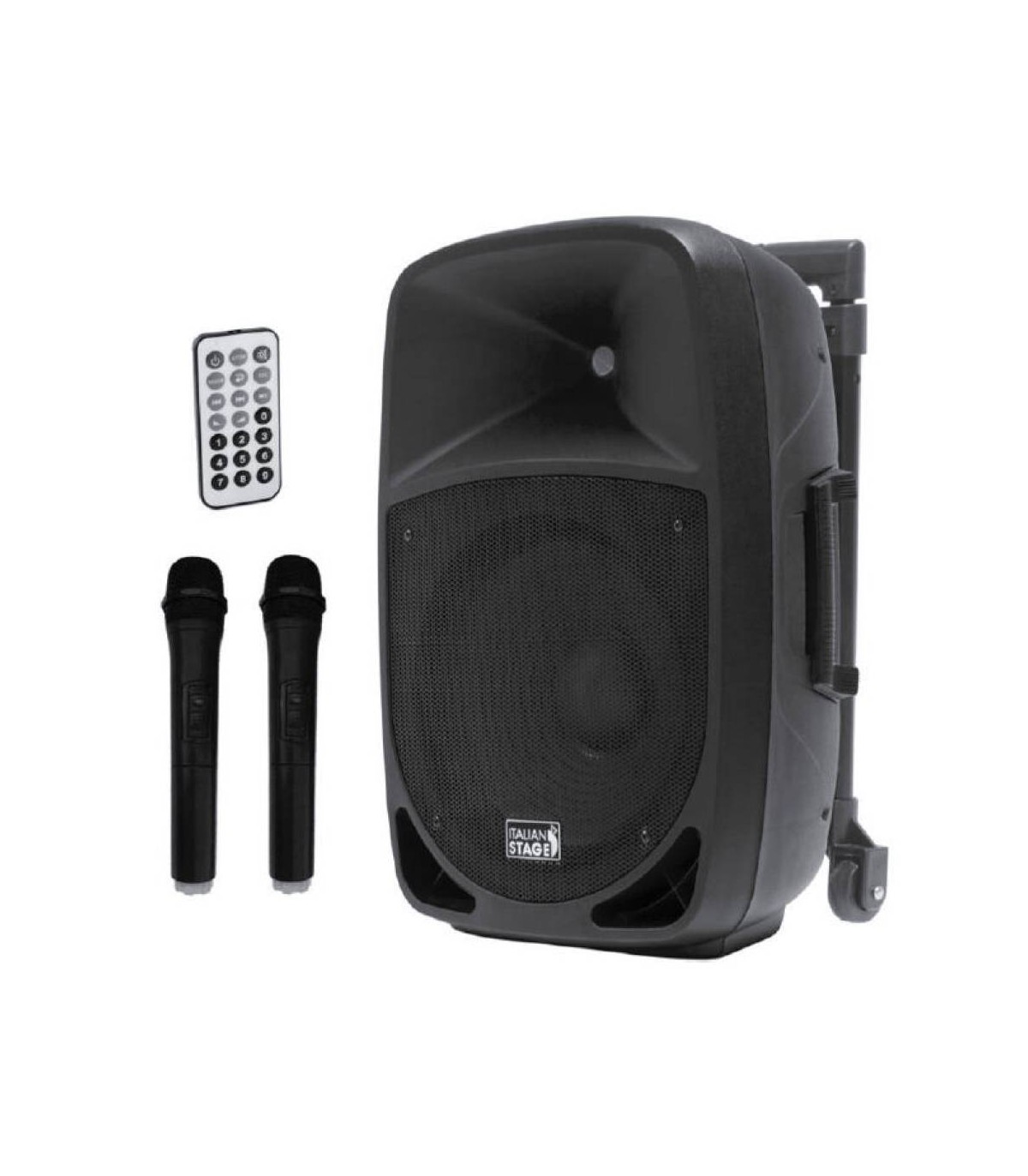 Diffusore portabile a batteria in PP 15’’ con MP3 player, SD card, USB, Bluetooth, Telecomando IR. - 2 Radiomicrofoni UHF(863/865 Mhz). - Woofer 15’’. - Driver 1’’. - Potenza RMS 100W Class D. - Picco 200W. - EQ grafico a 5 bande. - Risposta in frequenza 38hz-18khz