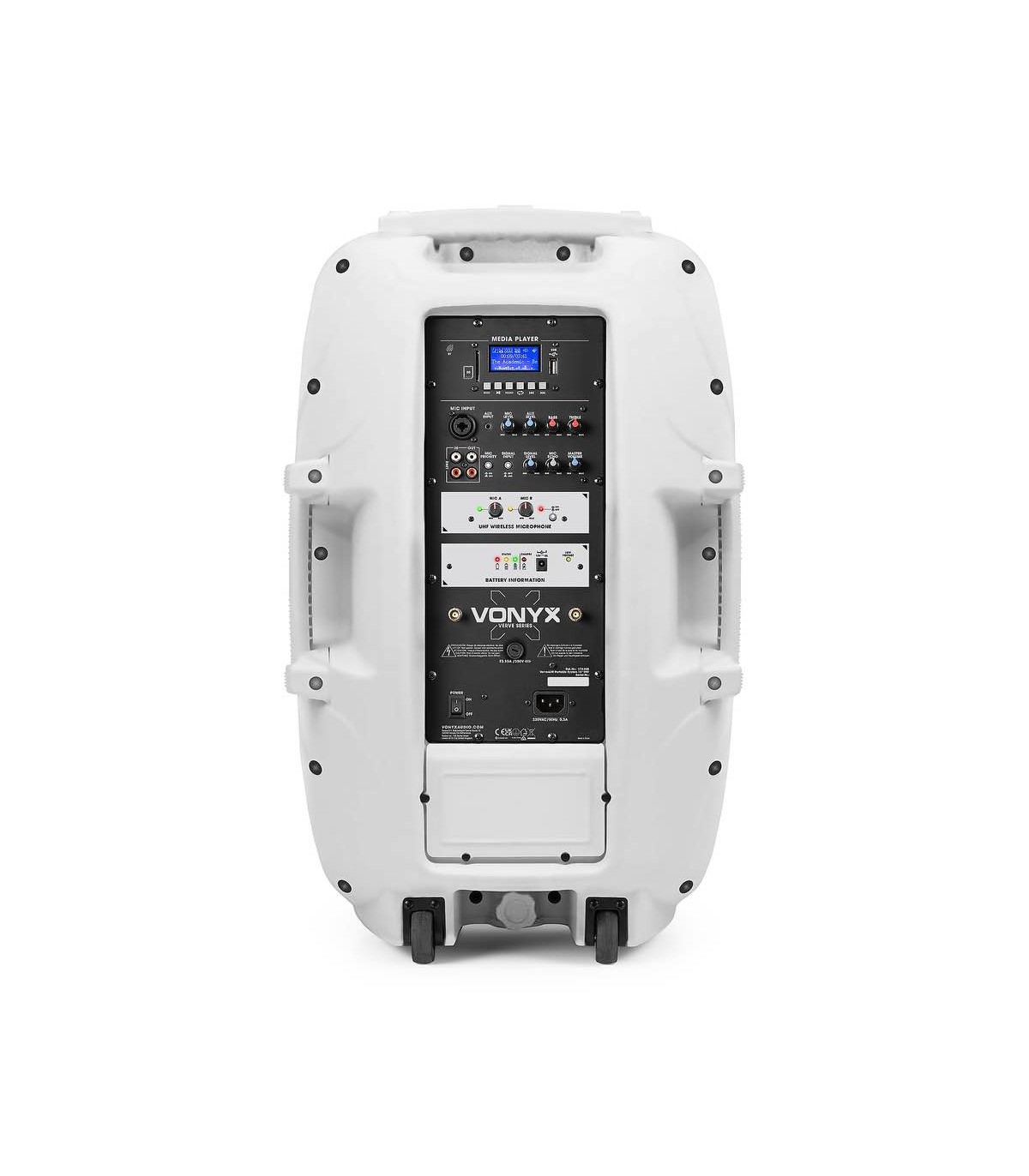 Il Verve è inoltre progettato per essere altamente portatile e facile da trasportare. Il sistema è dotato di una comoda maniglia del carrello e di ruote, che lo rendono facile da spostare. Include anche una batteria ricaricabile che fornisce fino a 7 ore di riproduzione continua, quindi puoi portarlo con te ovunque tu vada.
