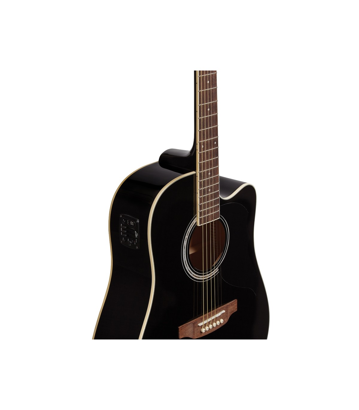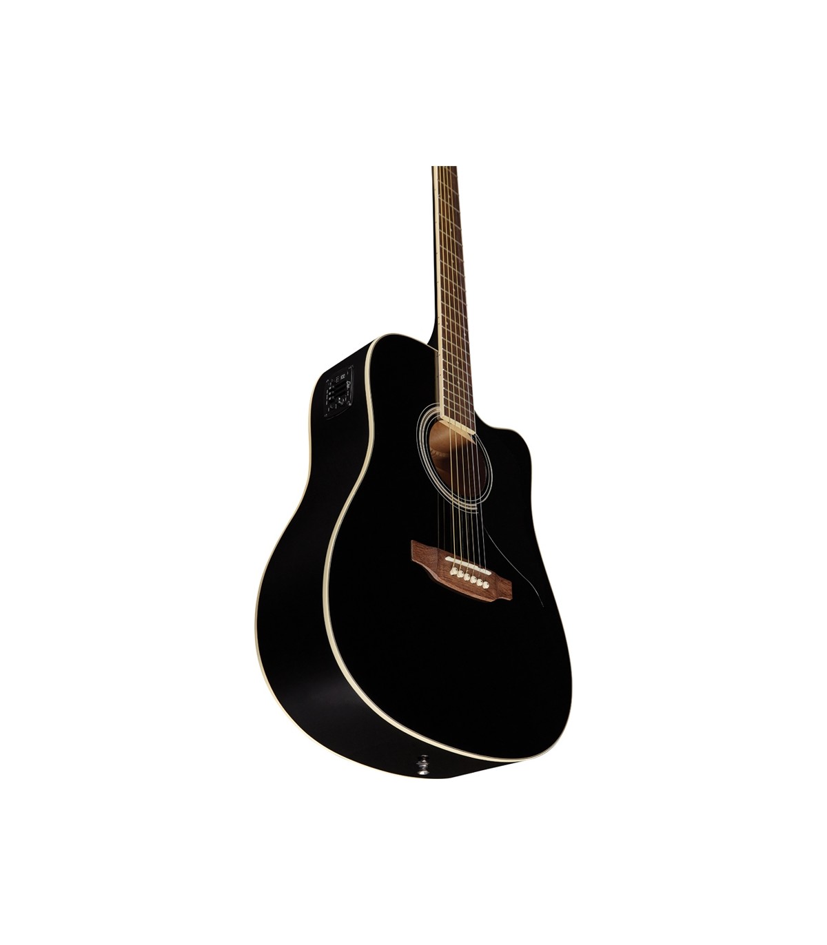 La Ranger CW EQ Black è la chitarra acustica elettrificata con forma Dreadnought spalla mancante di casa Eko Guitars, amplificata con sistema Eko SE30. Si presenta con Top in Abete, fasce e fondo in Linden, manico in Okoumè e tastiera in South American Roupanà. Una chitarra acustica dal costo contenuto, perfetta per un utilizzo live, per gli studenti e per chi decide di iniziare lo studio della chitarra con uno strumento affidabile e performante.