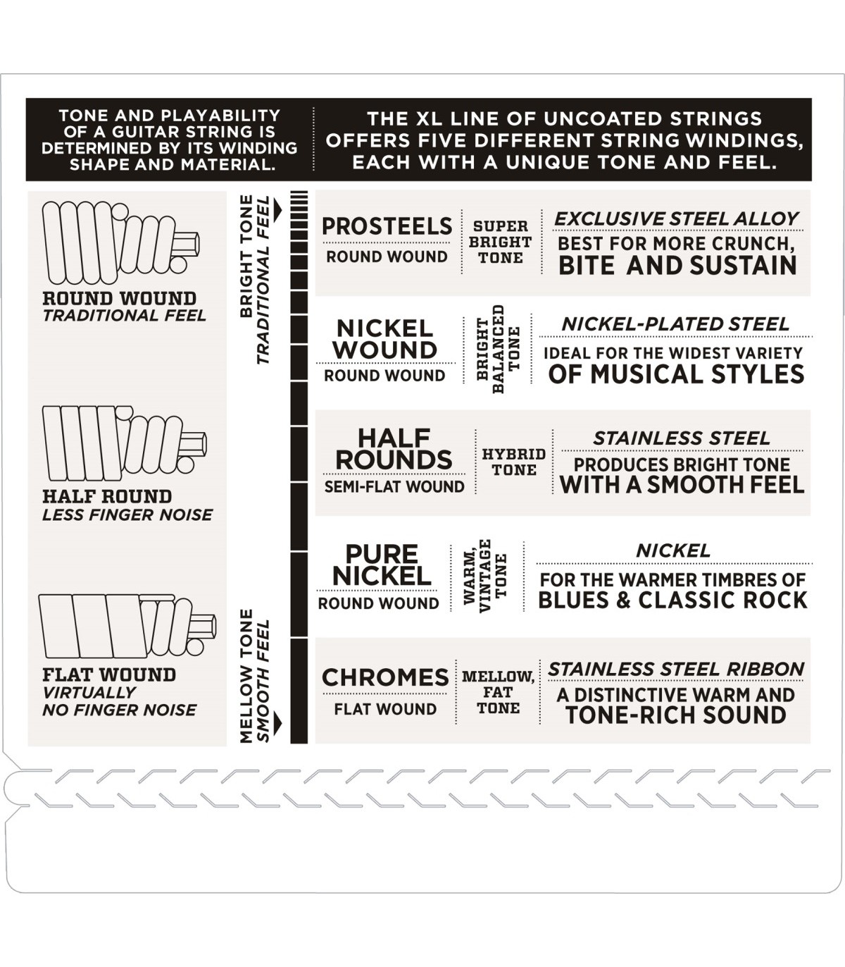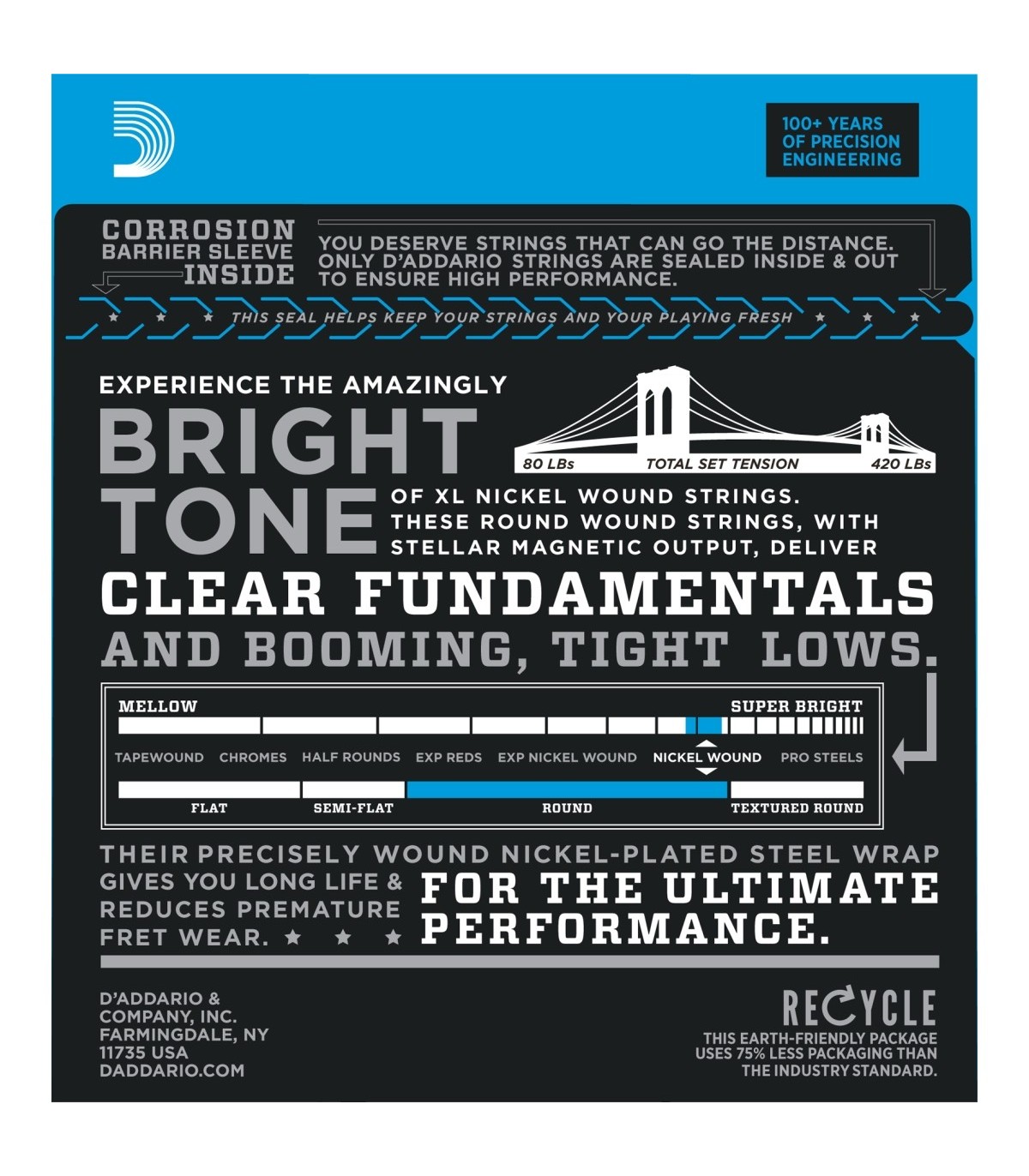 Le D'Addario XL avvolte in nickel per basso sono universalmente riconosciute come "le corde preferite" tra i bassisti di tutti i generi e stili. Tutte le corde XL sono avvolte con precisione sulle nostre macchine a controllo digitale, grazie alle quali viene garantita un'eccellente intonazione, una fondamentale solida e un'uniformità senza precedenti. Ogni singola corda viene avvolta con acciaio placcato al nickel, che conferisce il classico suono brillante con un'eccellente risposta magnetica ai pick up, per un timbro complessivo di grande fascino e adattabile a una pletora di stili e generi musicali.