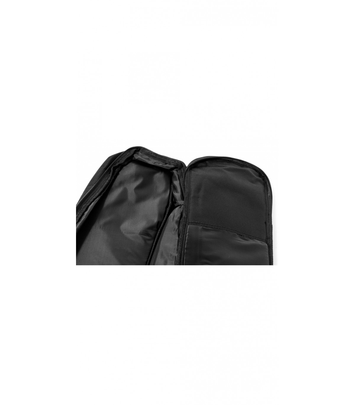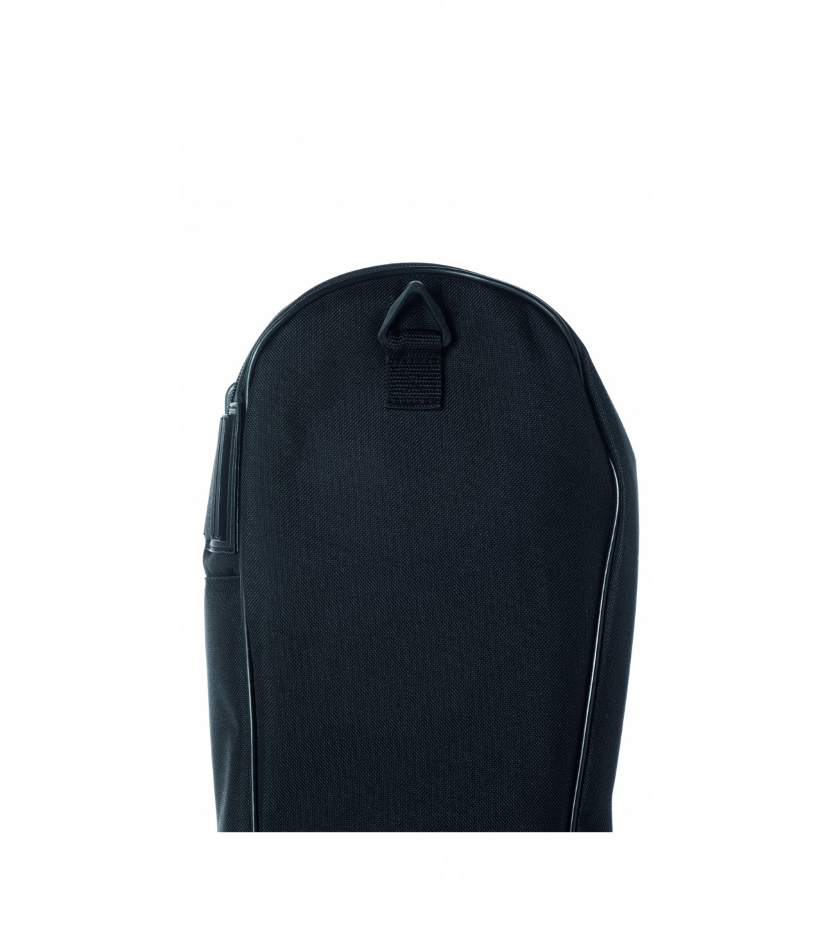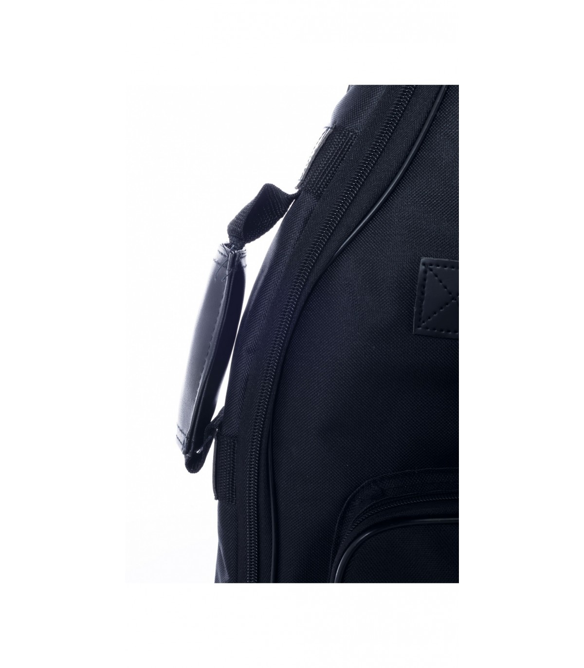 Borsa morbida serie Training Line per chitarra classica, con imbottitura da 10 mm. Realizzata in "Oxford cloth 600D" antistrappo e bordatura in PVC, colore nero. Maniglia imbottita. Tracolla doppia regolabile e ampia tasca frontale e superiore. Gommini paracolpi in gomma naturale. Robuste cerniere lampo cucite con nylon antistrappo. Gancio posteriore. Rinforzo interno a protezione di corde e ponte.