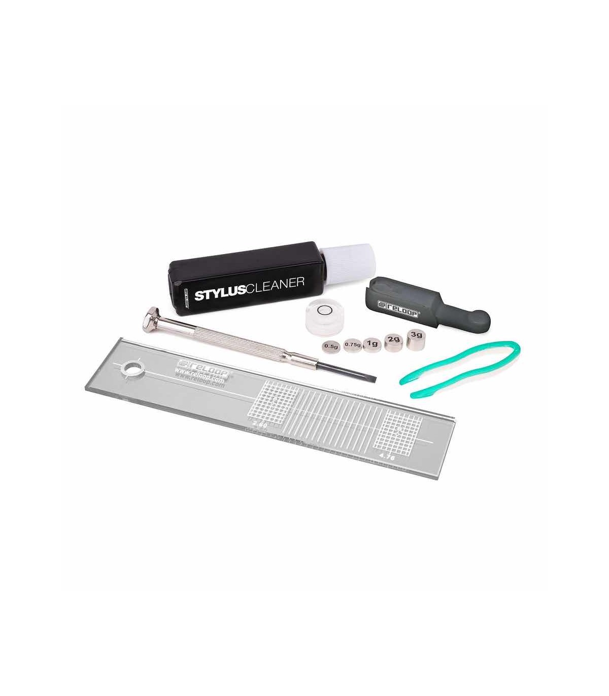 Kit con tutti gli accessori necessari per allineare, pulire e prendersi cura in modo professionale sia del giradischi che della testina. Include: goniometro, liquido per la pulizia, cacciavite, livella a bolla, bilancia con 5 pesi, pinzetta.