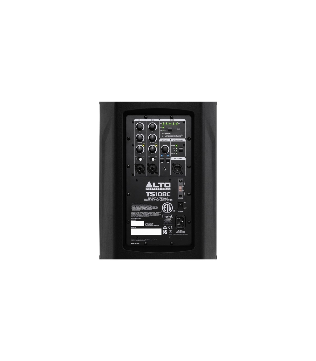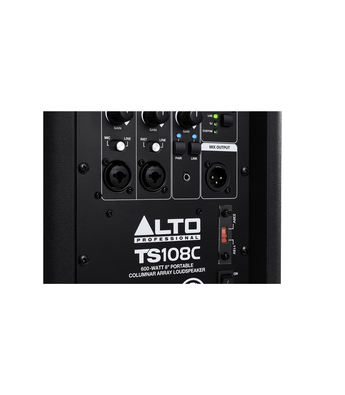 Diffusore a colonna attivo, portatile, con sub da 8" e un array da 6 driver da 2,75". Amplificazione: 600W di picco, 300W RMS: 200 sulle basse, 100 sulle alte. Max SPL 123dB. Copertura 100°×30°, Risposta in frequenza: dai 55Hz ai 15kHz (-3dB), 35Hz/20kHz (-10dB). Mixer integrato 3 canali con EQ 2 bande e riverbero sui primi 2 dotati di ingressi Combo, Ch3 Bluetooth Audio (o Aux stereo analogico mini-jack) con Stereo-Link e per la connessione all'Alto Pro App; Mix Out XLR. Dimensioni e peso: Sub 49,5×31,8×39,6cm; colonna 47,2×8,6×9,7cm (×2); da assemblato 185,9x 31,5x40,4cm; 15,9KG. In dotazione: cavo d'alimentazione da 1,5m e sacca a tracolla per il trasporto.