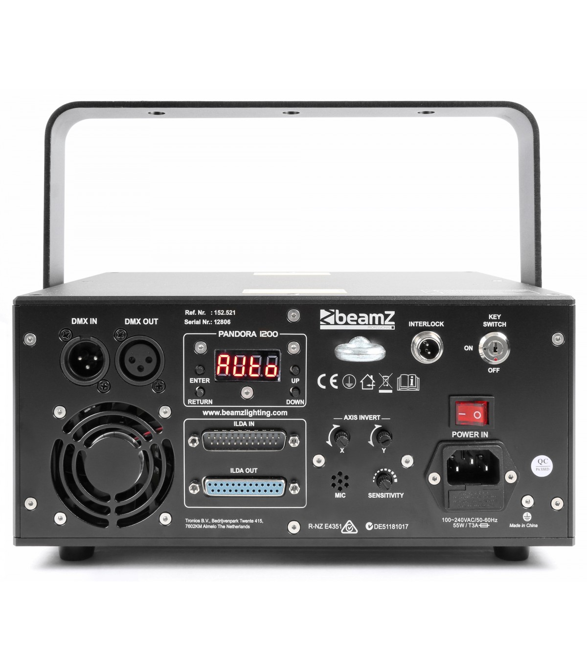 Pandora 1200 ha una potenza di uscita garantita di 1W e una potenza massima in uscita di 1,2 W a colori in rosso, verde e blu. Questa luce laser ha una modulazione TTL. Ciò significa che è possibile creare 7 colori alla massima intensità. Combinando così tanta potenza con i suoi scanner grafici 25K di precisione, per cui la nitidezza e la forma del fascio sono estremamente avanzate, rendendo queste unità adatte per applicazioni professionali di alto livello. Il laser può essere controllato su ILDA e DMX o eseguire autonomamente in modalità automatica o attivata dal suono. È possibile produrre l'effetto esatto desiderato con il controllo DMX e ILDA. Con una macchina del fumo, puoi vedere i fasci nell'aria. Questo farà impazzire l'intero spazio per un fantastico spettacolo di fasci di luce. Questo lo rende adatto a qualsiasi tipo di applicazione: installazioni fisse, utilizzo mobile, progetti multimediali, applicazioni esterne a lunga distanza e proiezioni grafiche più precise.