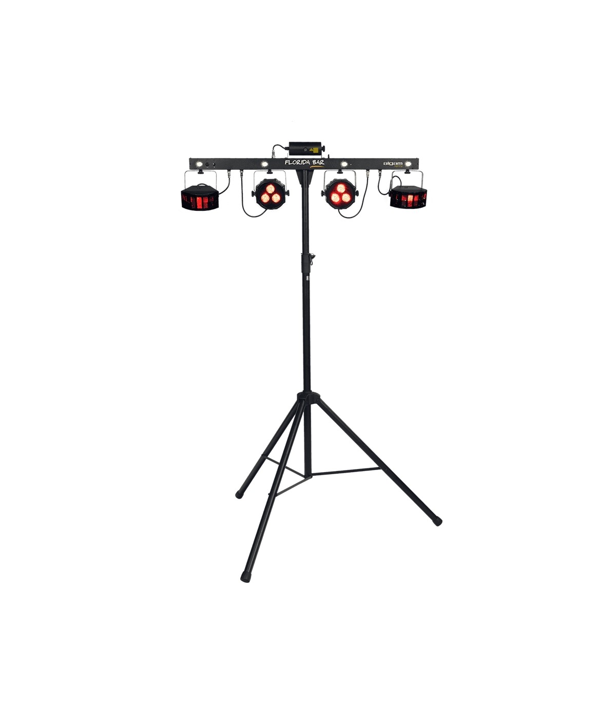 Florida-Bar è il set d'illuminazione 3 in 1 di Algam Lighting composto da due Par LED, un Laser e due proiettori Derby montati su un supporto telescopico. Una soluzione completa e versatile fornita di custodia morbida e pedaliera wireless per il controllo dei proiettori. Florida-Bar include anche l'effetto Strobo grazie a 4 LED bianchi da 1W, il protocollo DMX e un microfono integrato che ti permetterà di essere sempre sincronizzato con la musica circostante.