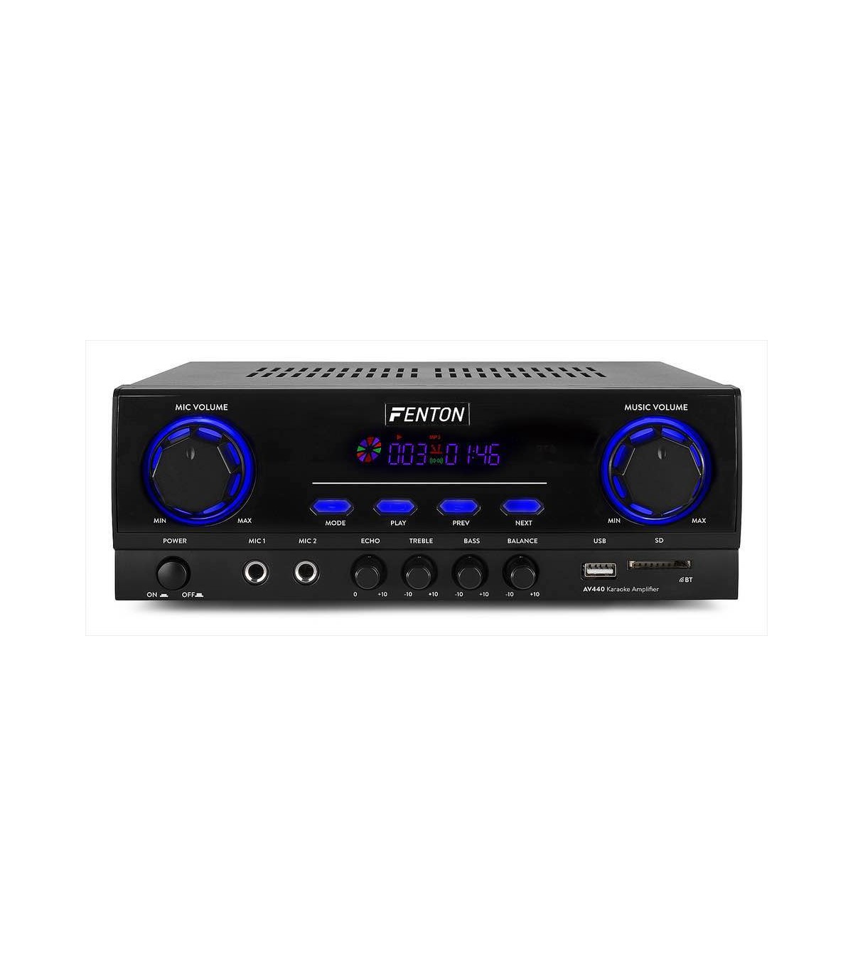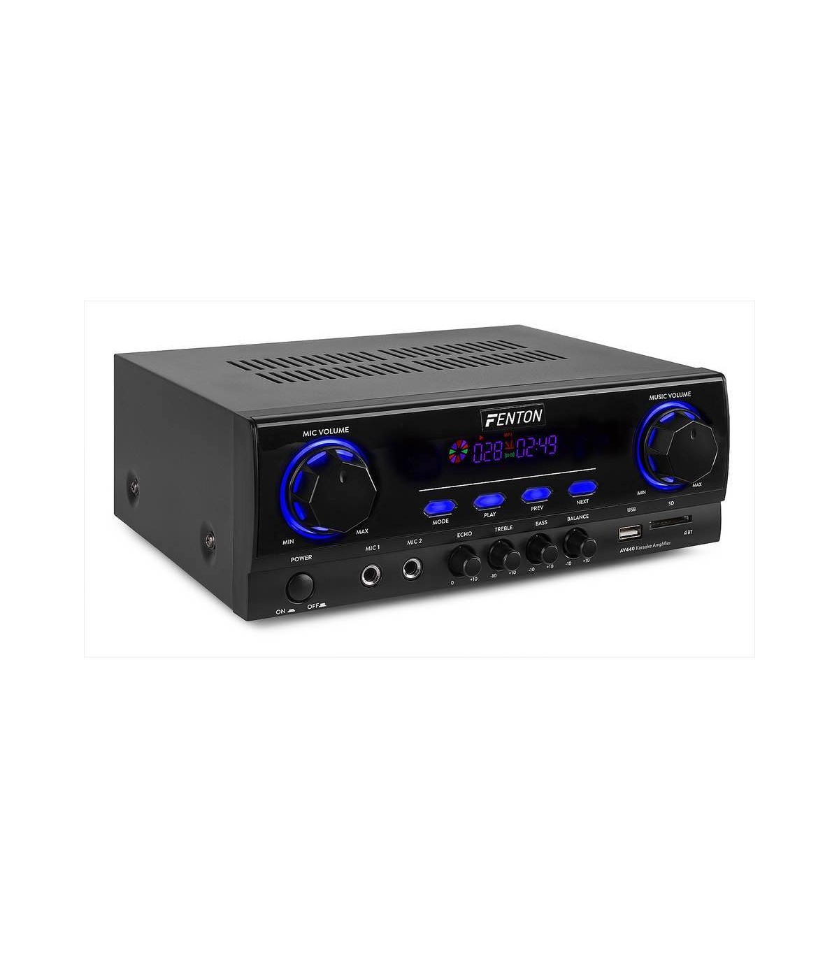 L'AV440 è un moderno amplificatore per karaoke a 2 canali da 2x 200 W dotato di un lettore multimediale e pulsanti illuminati di blu. Dotato di telecomando, due ingressi microfonici con controllo dei toni, eco e display dinamico. Perfetto anche per applicazioni come HiFi e musica di sottofondo.