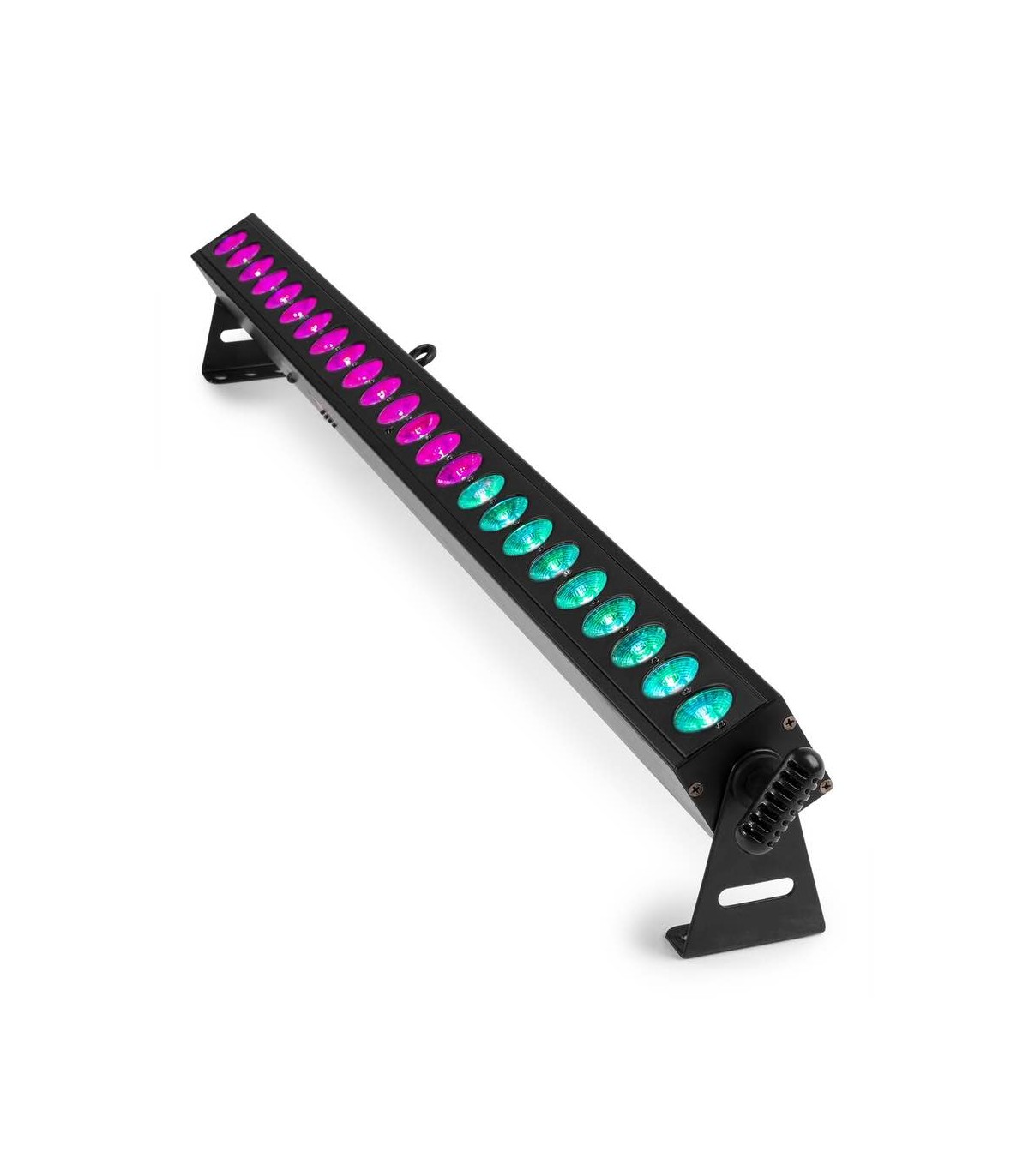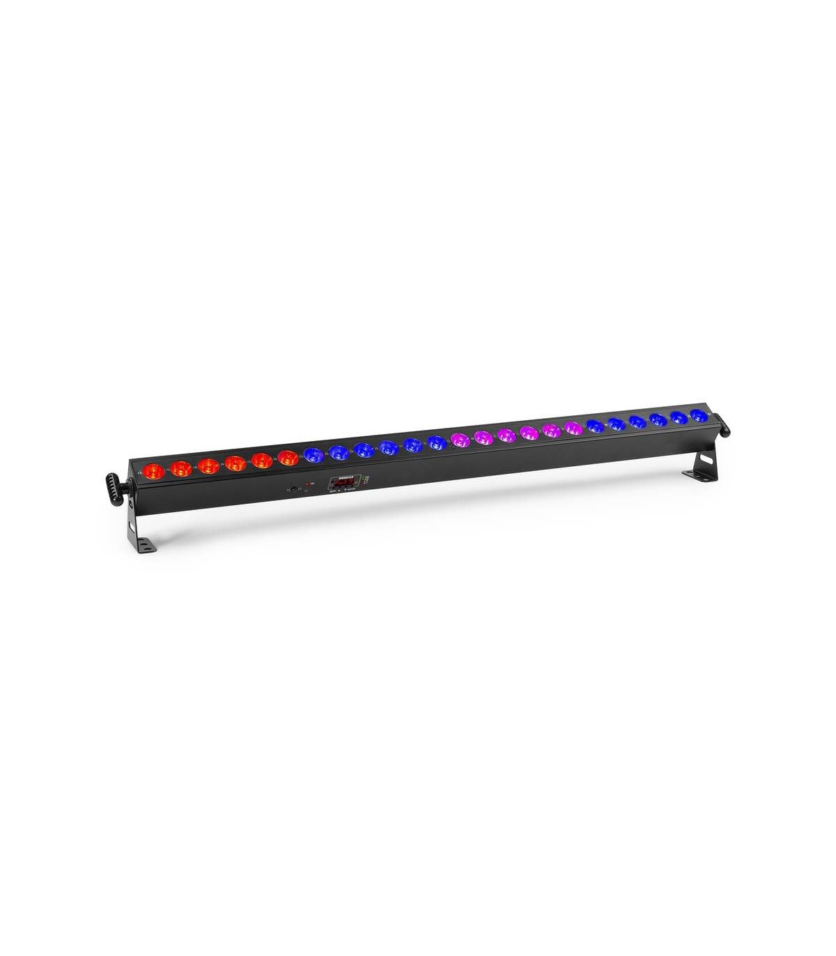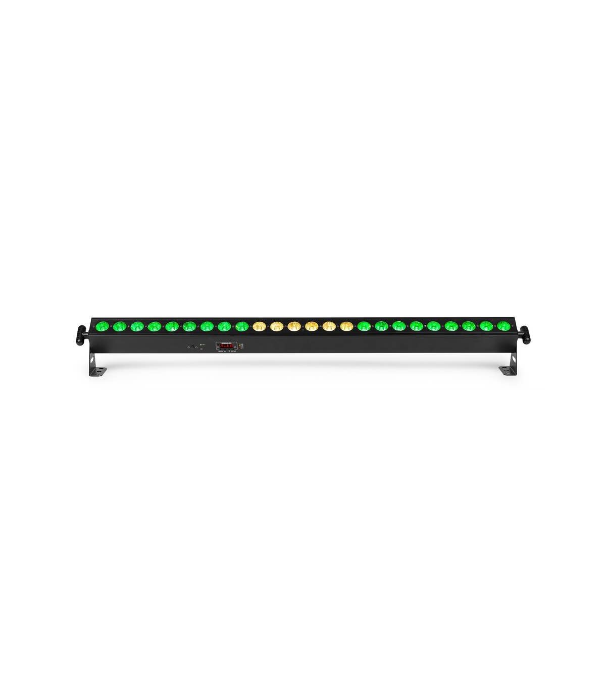 BBB243 è una barra LED compatta e leggera ricaricabile alimentata a batteria al litio che offre un'ampia gamma di miscelazione dei colori RGB per il Wash di palchi o pareti, con la libertà di configurare il dispositivo in qualsiasi momento, senza problemi di cavi. La batteria al litio incorporata manterrà una carica fino a 10 ore (a singolo colore) da una carica completa singola. Può anche essere collegato alla rete elettrica con il cavo incluso per una carica illimitata. Il BBB243 può essere utilizzato in diversi modi: utilizzare uno dei suoi programmi automatici, modalità musica o modalità DMX (e wireless DMX). Ideale per l'uso in spazi ristretti, su palchi, ristoranti e Bar.