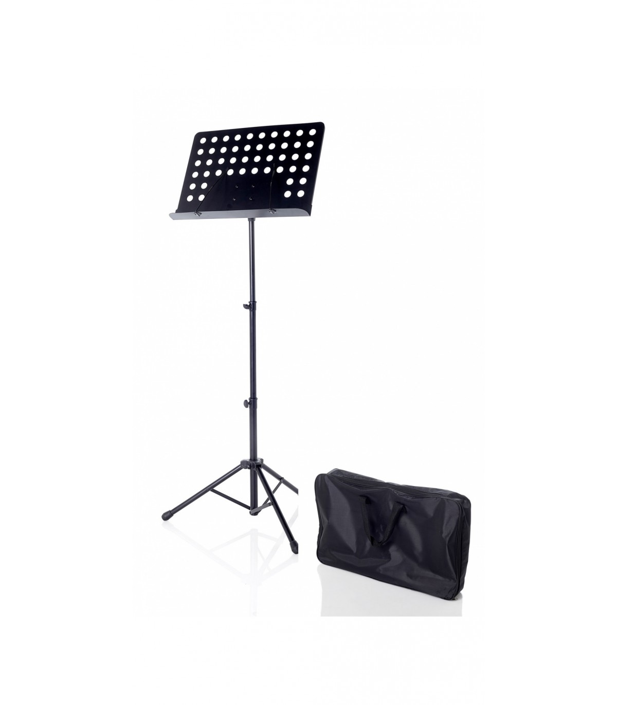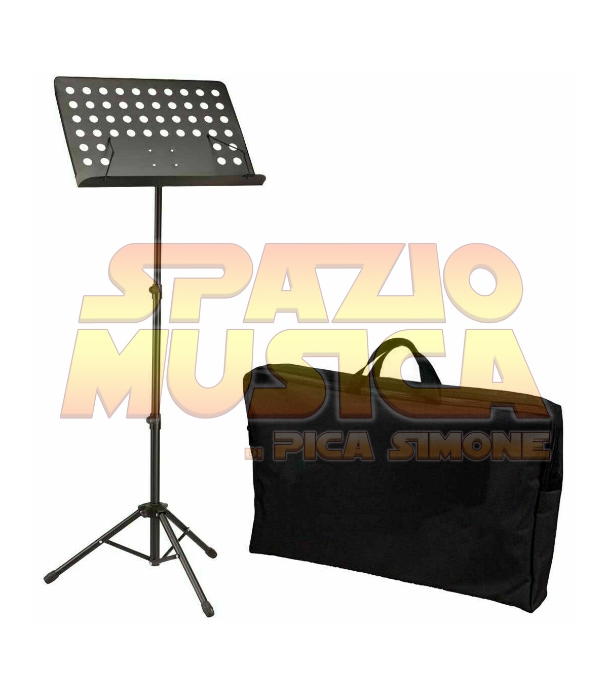 Leggio in acciaio con tavola in lamiera forata. Ampia borsa in nylon per un facile trasporto. Attacco posteriore della tavola estraibile con quattro punti di fissaggio e regolazione con manopola. Raccordo gambe in nylon caricato.