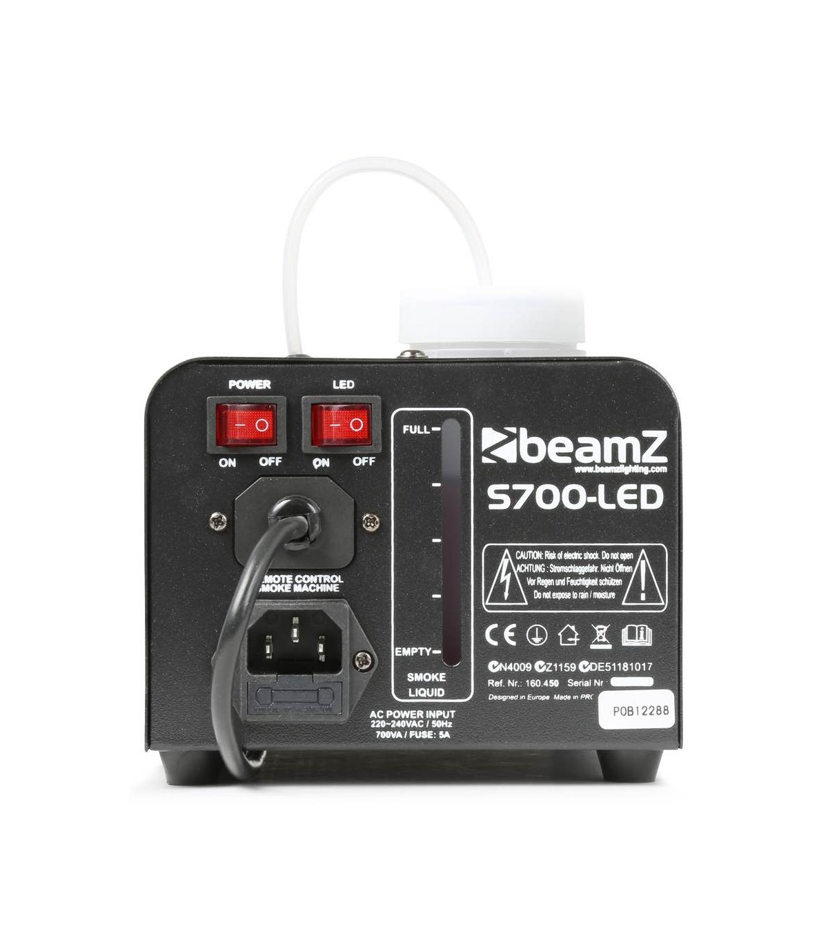Macchina del fumo compatta da 700 W con LED blu per effetto ghiaccio con serbatoio incorporato per il fluido. L'effetto ghiaccio LED può essere disattivato sul retro della macchina del fumo. La produzione di fumo può essere attivata tramite telecomando in dotazione.
