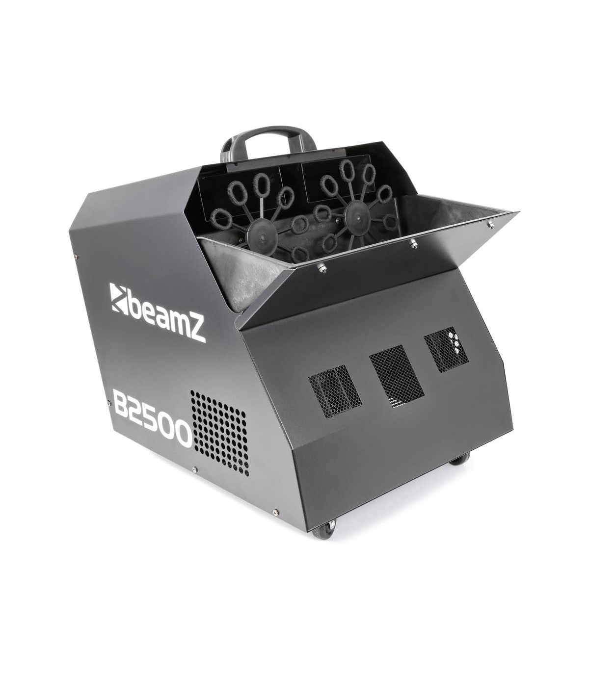 Questa nuova, attraente e affidabile macchina a bolle con ruote doppie ha una vasta gamma e produce un effetto vorticoso grazie ai doppi ventilatori che distribuiscono meglio le bolle e le fanno saltare in aria. La macchina crea milioni di bolle colorate.