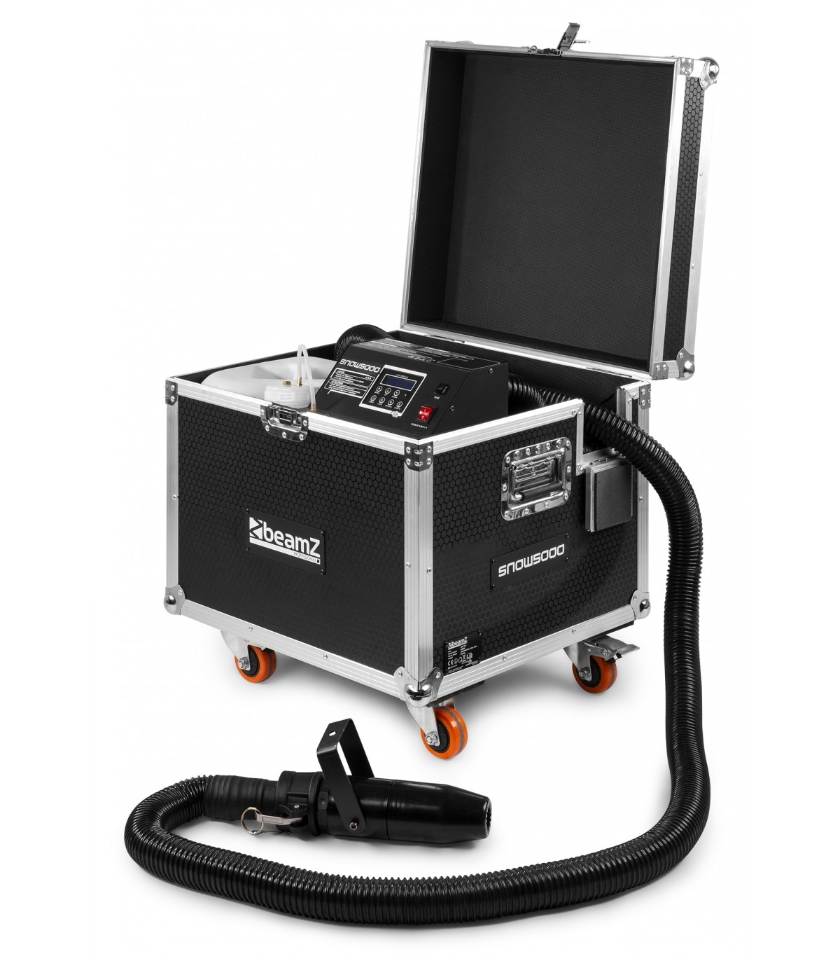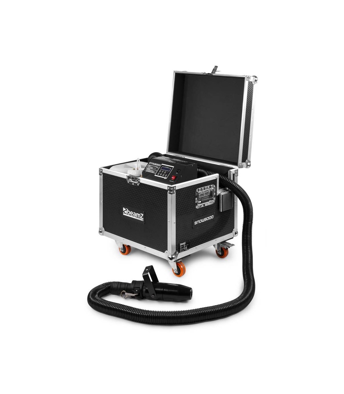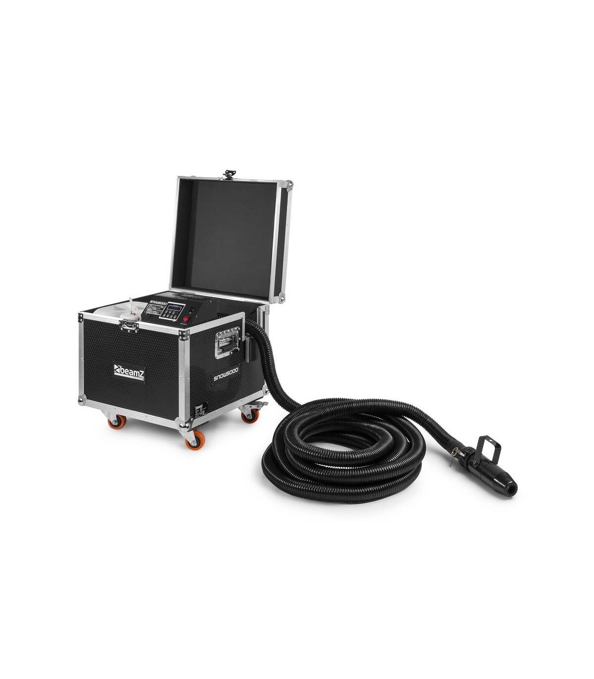 SNOW5000 produce una quantità enorme di neve artificiale che imita perfettamente la neve reale sul palco! L'aria e la neve vengono erogate tramite l'ugello collegato a un tubo da 10 m, in cui è possibile regolare il volume d'aria e la velocità del fluido per ottenere gli effetti neve perfetti, dalla neve sottile alle condizioni simili alla tormenta! Questa macchina professionale e il serbatoio del liquido (20 litri) sono collocati all'interno di una robusta valigetta con ruote. Il tubo dell'aria lungo 10 m può essere facilmente montato su un supporto o in traliccio, utilizzando un morsetto standard. Perfetto per l'uso da società di noleggio per produzioni medie e grandi.