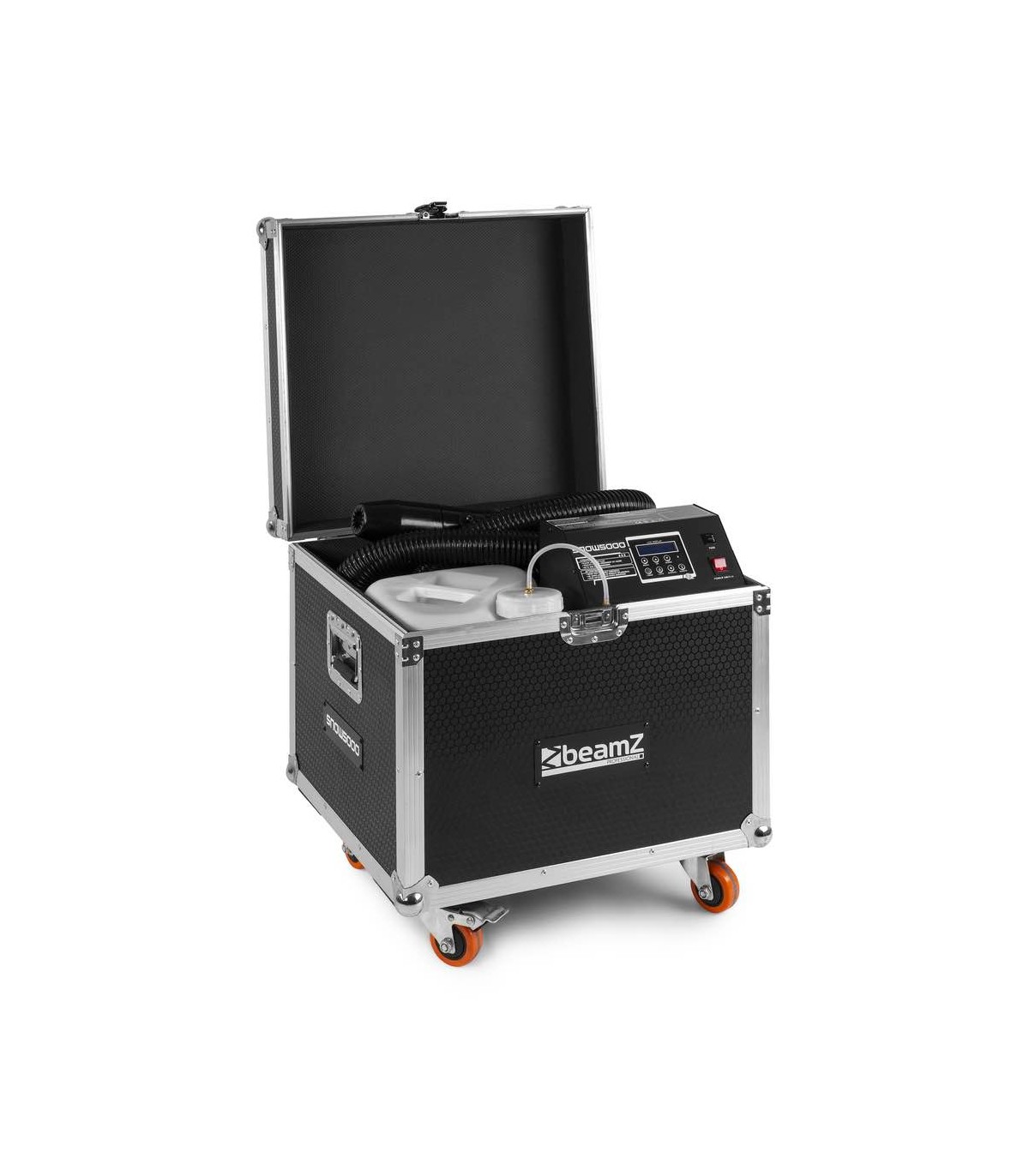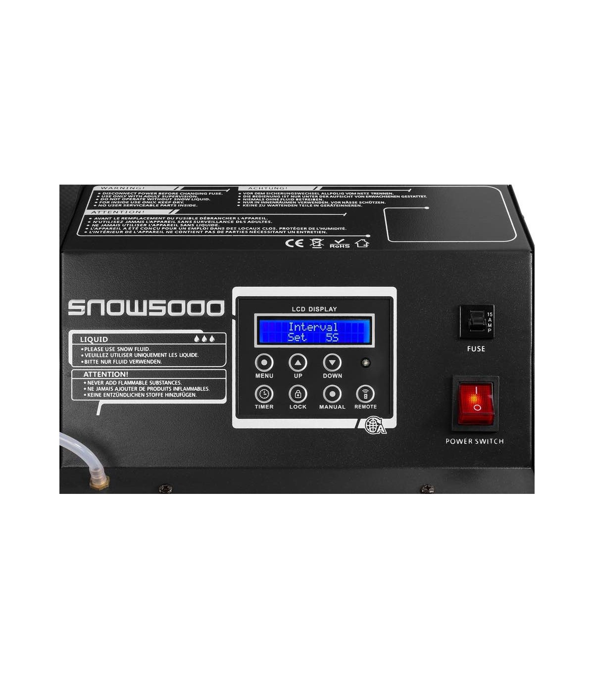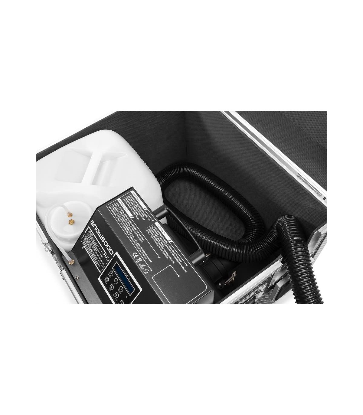 SNOW5000 produce una quantità enorme di neve artificiale che imita perfettamente la neve reale sul palco! L'aria e la neve vengono erogate tramite l'ugello collegato a un tubo da 10 m, in cui è possibile regolare il volume d'aria e la velocità del fluido per ottenere gli effetti neve perfetti, dalla neve sottile alle condizioni simili alla tormenta! Questa macchina professionale e il serbatoio del liquido (20 litri) sono collocati all'interno di una robusta valigetta con ruote. Il tubo dell'aria lungo 10 m può essere facilmente montato su un supporto o in traliccio, utilizzando un morsetto standard. Perfetto per l'uso da società di noleggio per produzioni medie e grandi.