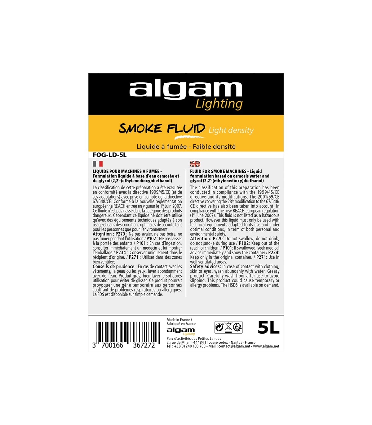 I liquidi Algam Lighting sono fabbricati in Francia secondo un processo estremamente rigoroso, nel rispetto di tutti gli standard e le norme legali necessarie per questa tipologia di prodotti. Affidabili ed efficienti, i liquidi Algam Lighting sono compatibili con la maggior parte delle macchine presenti sul mercato. Fumo, fumo basso, nebbia, neve, schiuma, bolle: una gamma professionale e completa per accompagnare ed allietare tutti i vostri eventi.