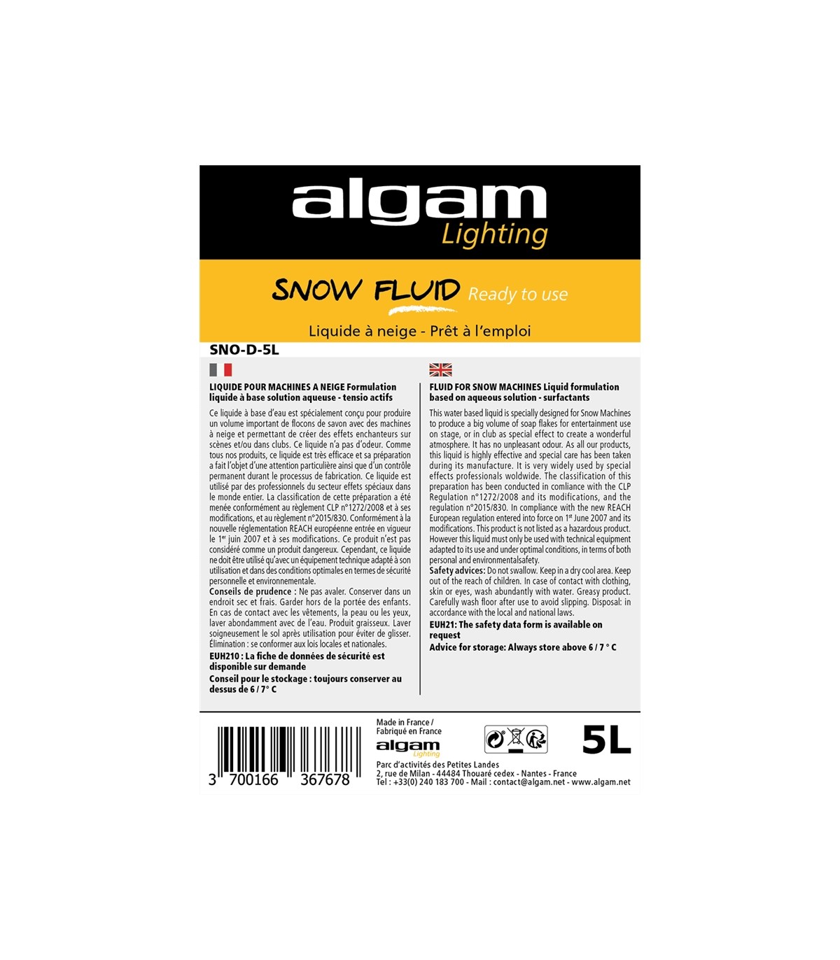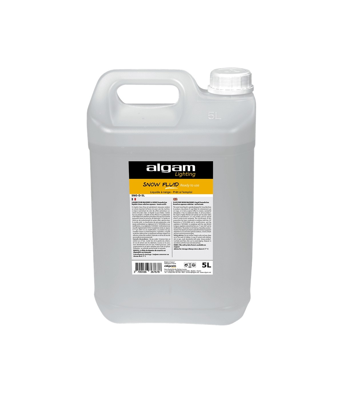SNO-D-5L è il liquido per la creazione di neve artificiale di Algam Lighting pronto all'uso e compatibile con la maggior parte delle macchine da neve presenti sul mercato. Tanica da 5 litri.