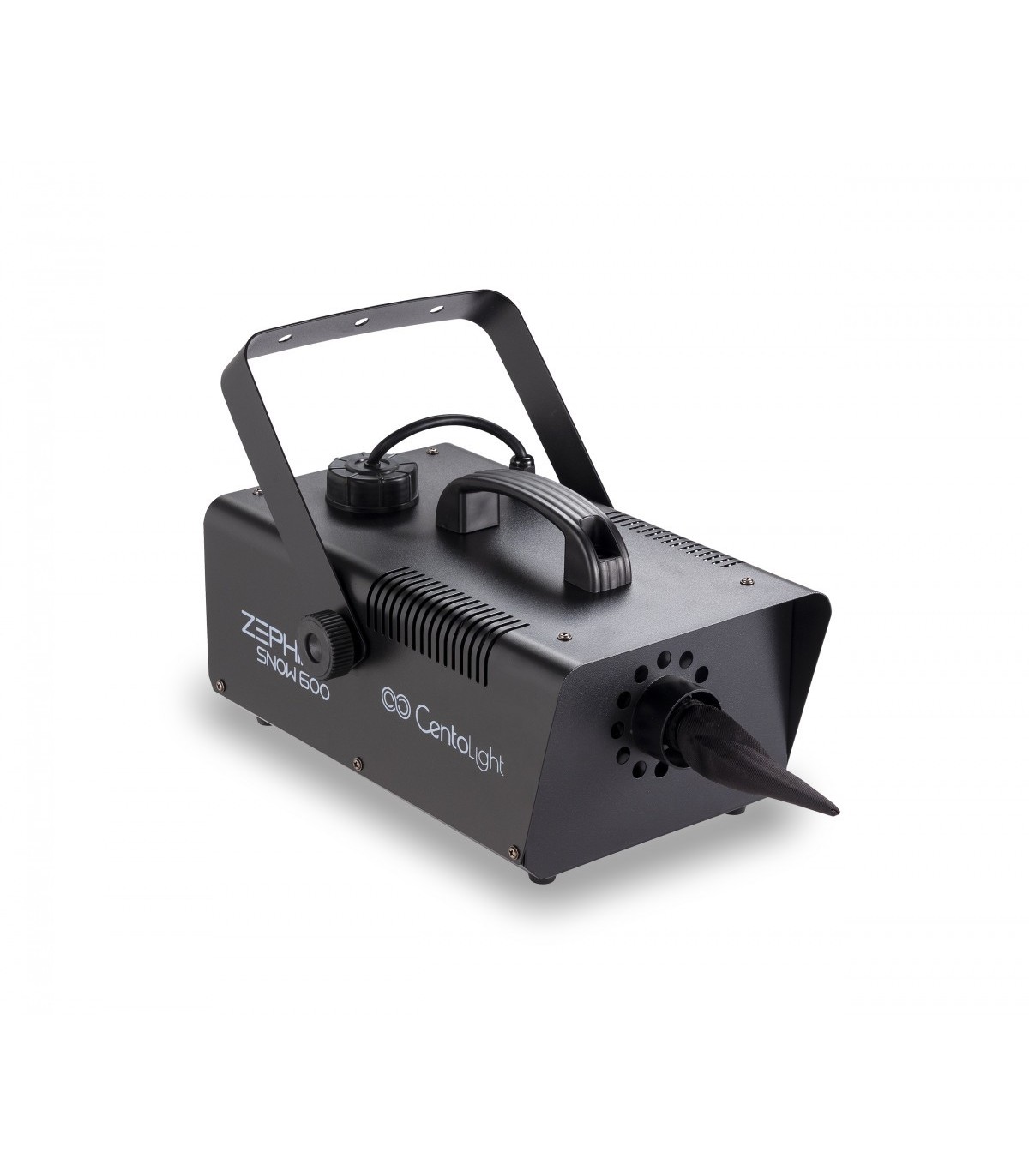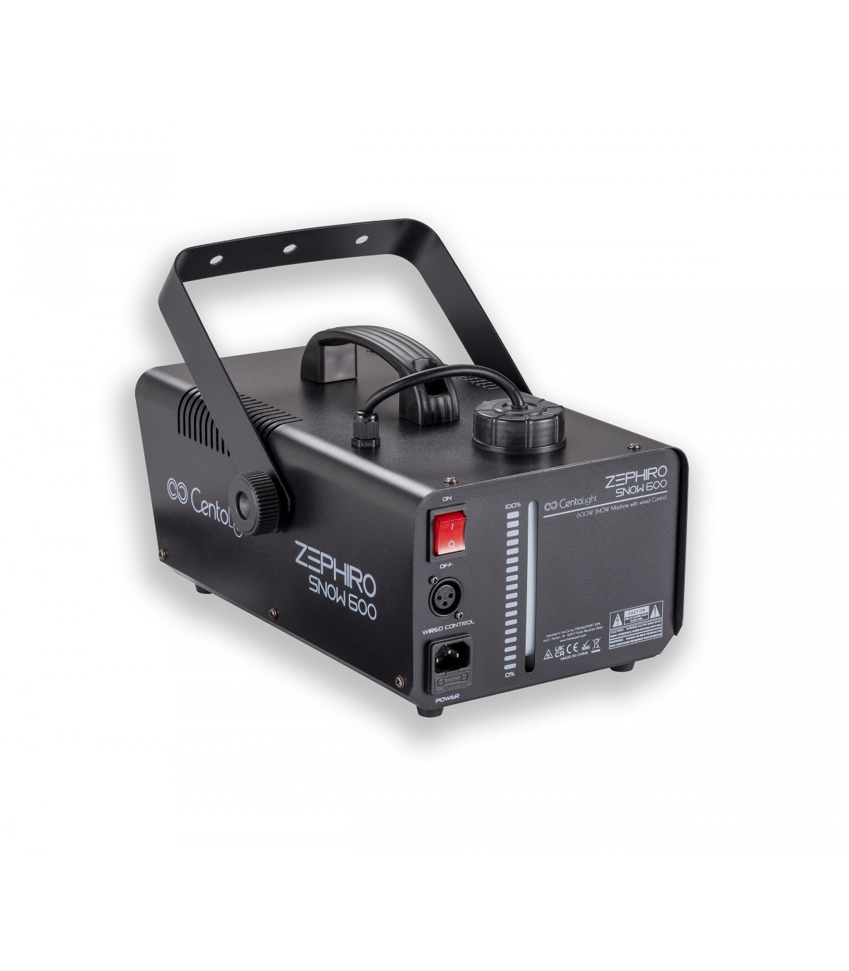 È noto come il mondo dello spettacolo e dell intrattenimento si basi sulla fusione tra musica, immagini, luci ed effetti ambientali. Il coinvolgimento sensoriale di chi fruisce l evento di intrattenimento è sempre più presente al giorno d oggi. Centolight ha ben chiara questa esigenza ed attraverso la linea Zephiro offre una vasta gamma di macchine per fumo, nebbia, bolle, neve e altro ancora. Zephiro Snow 600 è una macchina per neve compatta; pensata per le ambienti piccoli e medi e dotata controllo a filo. Genera una neve soffice e persistente, particolarmente apprezzata in tutte quelle situazioni in cui è richiesta una simulazione di scenari invernali e nevosi. Ha una potenza di 600W, è pensata per applicazioni al chiuso può coprire circa 30m2 con 1 litro di fluido.