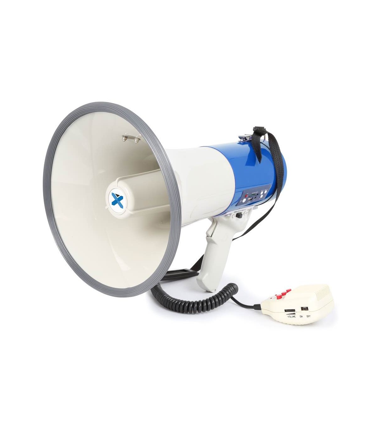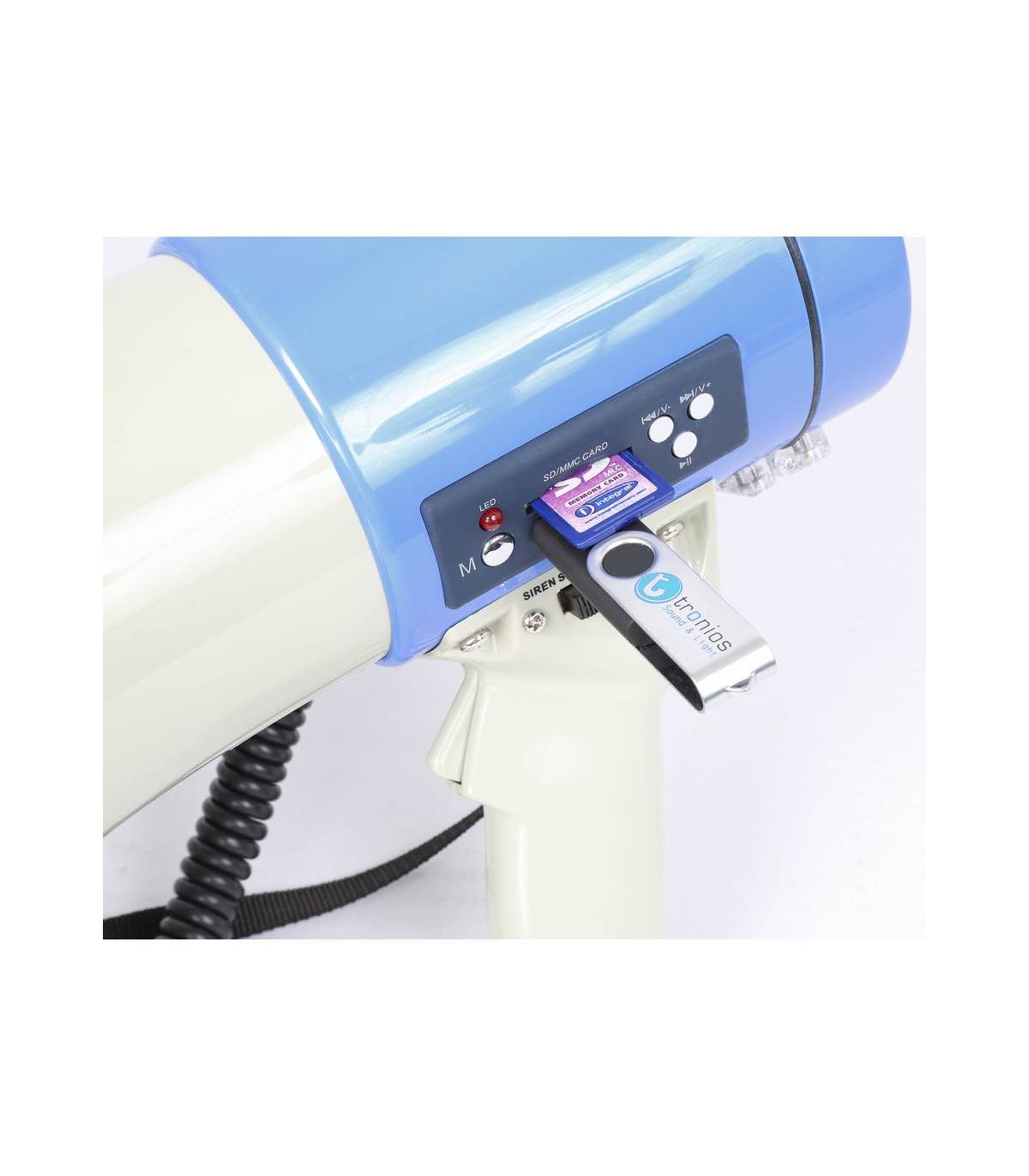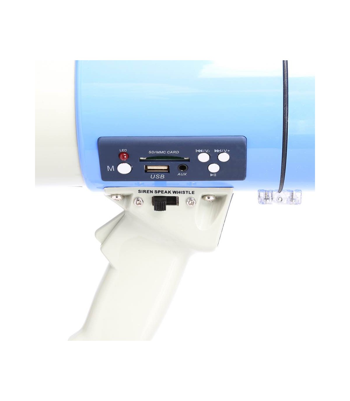 Potente megafono con amplificatore da 60W incorporato e microfono staccabile con cavo a spirale. Include slot per USB e SD, funzione registrazione e sirena, controllo del volume e tracolla regolabile. Copertura da 1.0 a 1.2km a seconda delle condizioni dell’ambiente.