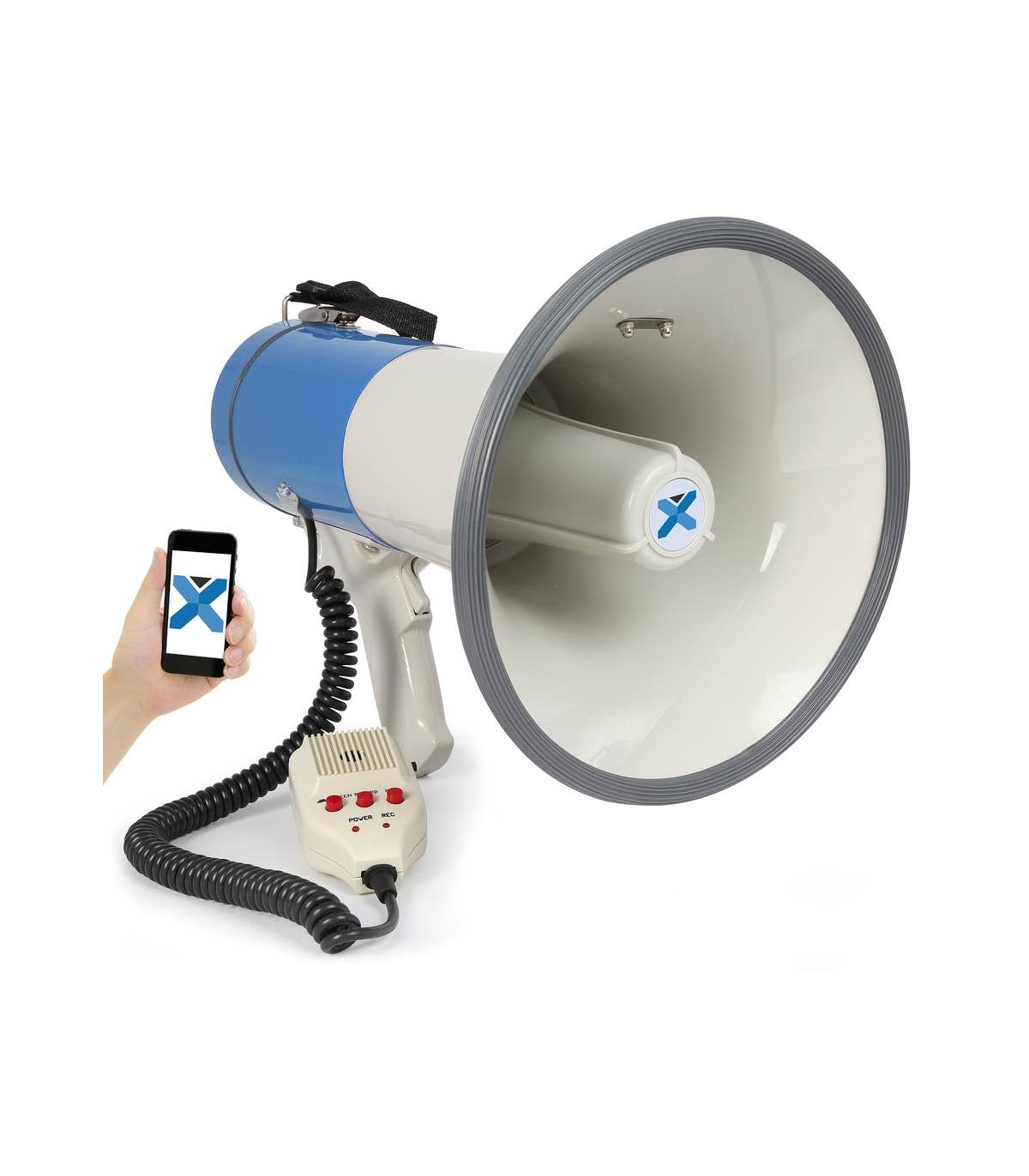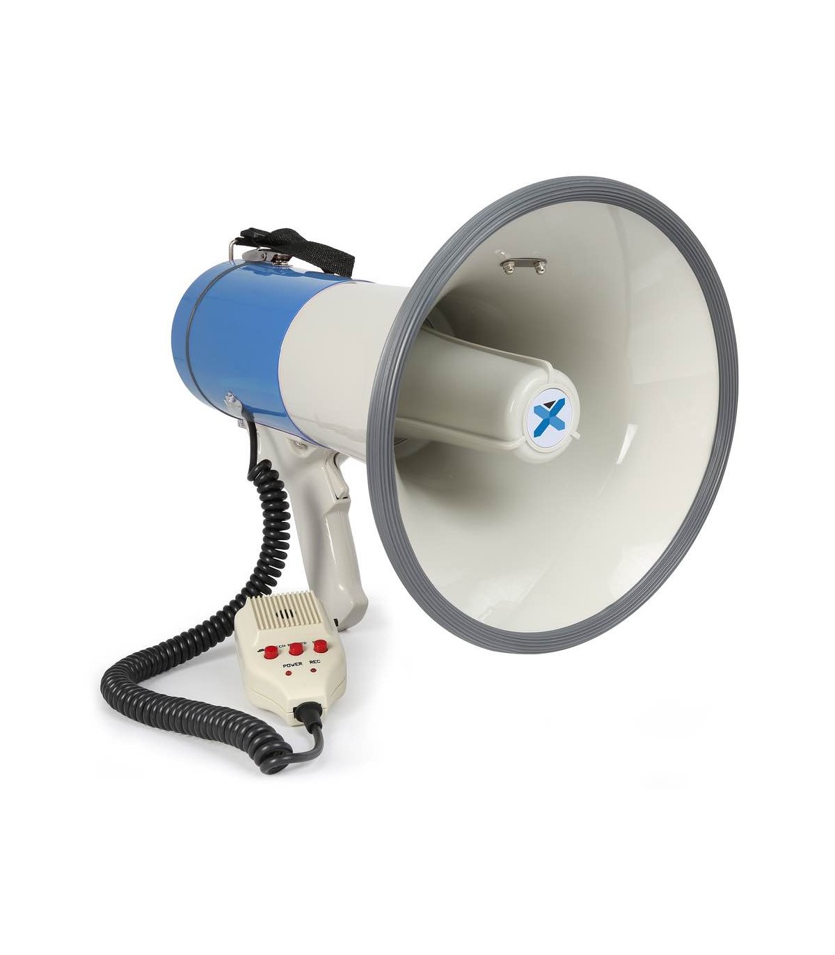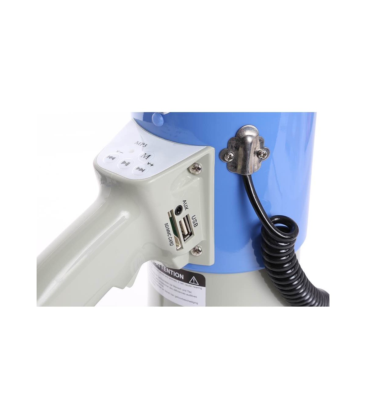 Potente megafono con amplificatore da 50W incorporato e microfono staccabile con cavo a spirale. Include ricevitore BT per streaming audio, ingresso USB / SD per la riproduzione di MP3, funzione registrazione, controllo del volume e tracolla regolabile. Copertura da 0.7 a 1.7 km a seconda delle condizioni dell'ambiente.