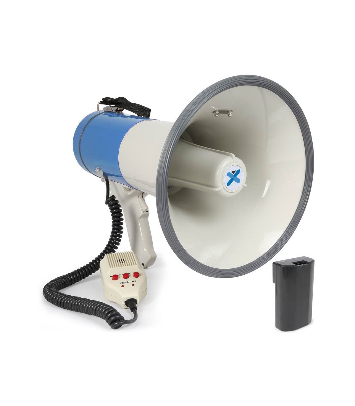 Potente megafono con porta USB e SD, batteria al litio, pannello di controllo MP3, amplificatore da 65W incorporato e micrófono staccabile anti feedback con cavo a spirale. Funzione sirena, controllo del volume e tracolla regolabile. Copertura da 1.0 a 1.2km a seconda delle condizioni dell'ambiente.