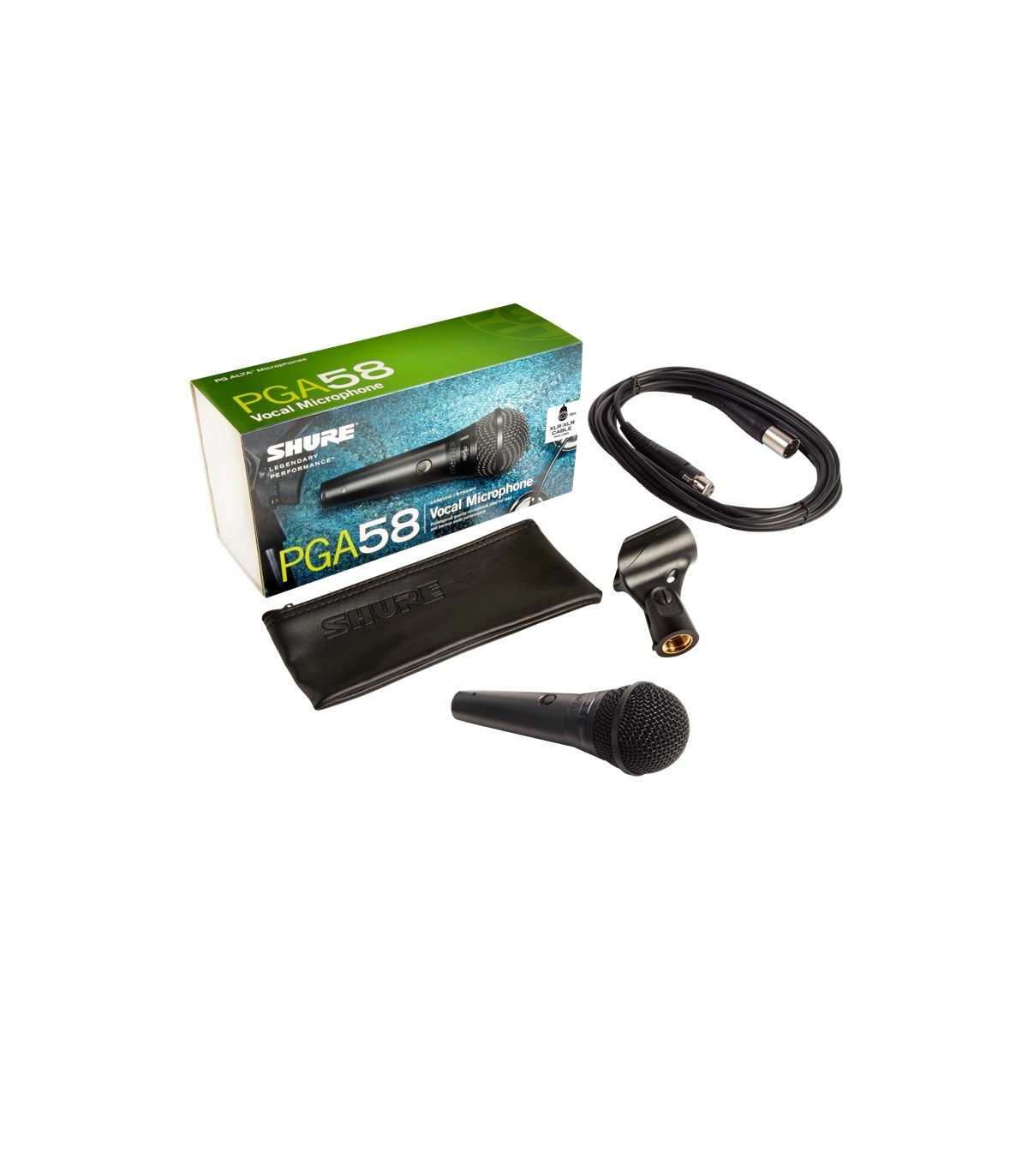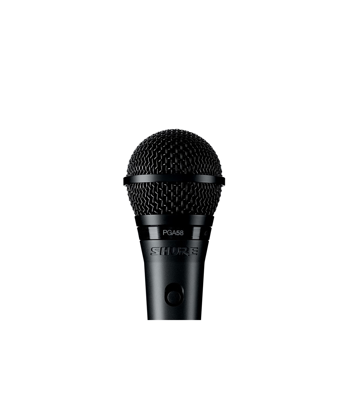 Ispirato dal suono del leggendario SM58, Shure PGA58 è un microfono dinamico, cardiode, dalla risposta ottimizzata che riprende la chiarezza naturale della voce solista e delle voci dei coristi, senza riprendere i rumori indesiderati. Incorpora un interruttore on/off per facilitarne il funzionamento. In dotazione: adattatore per asta, cavo da XLR femmina a XLR maschio lungo 4,57 m, astuccio con cerniera.