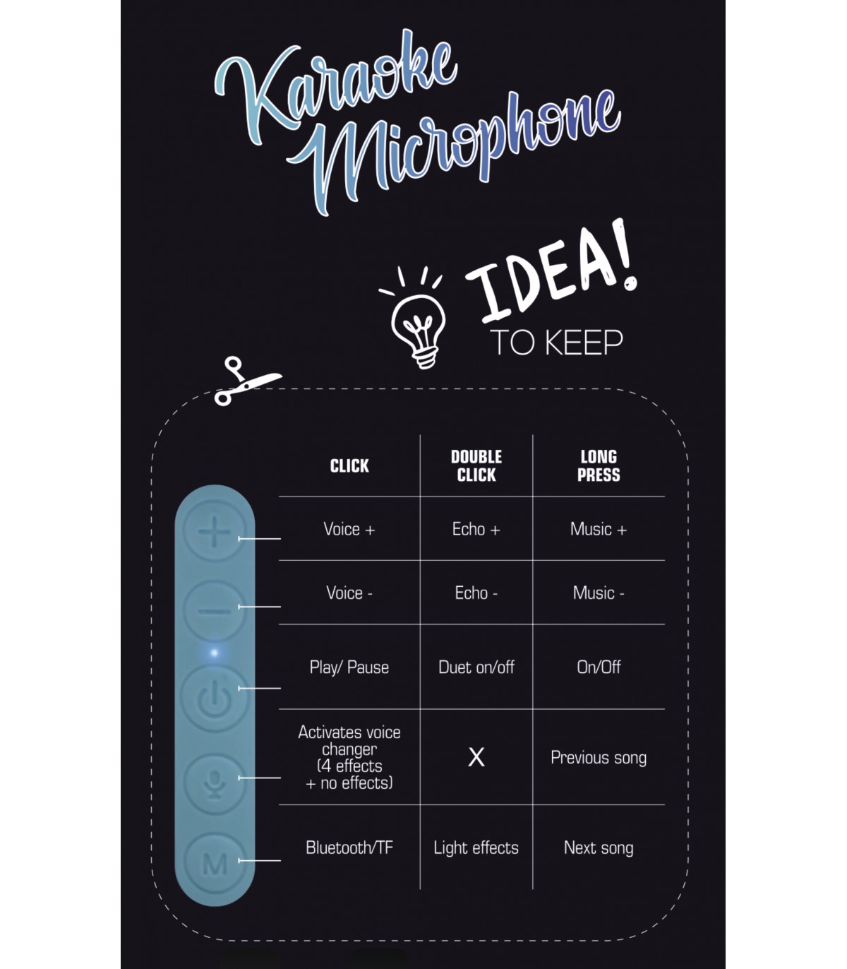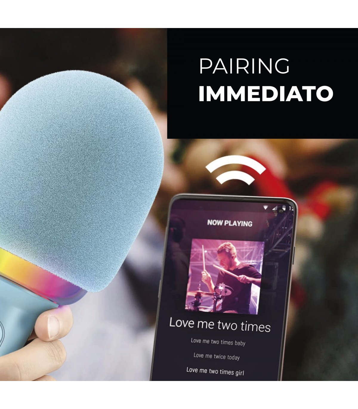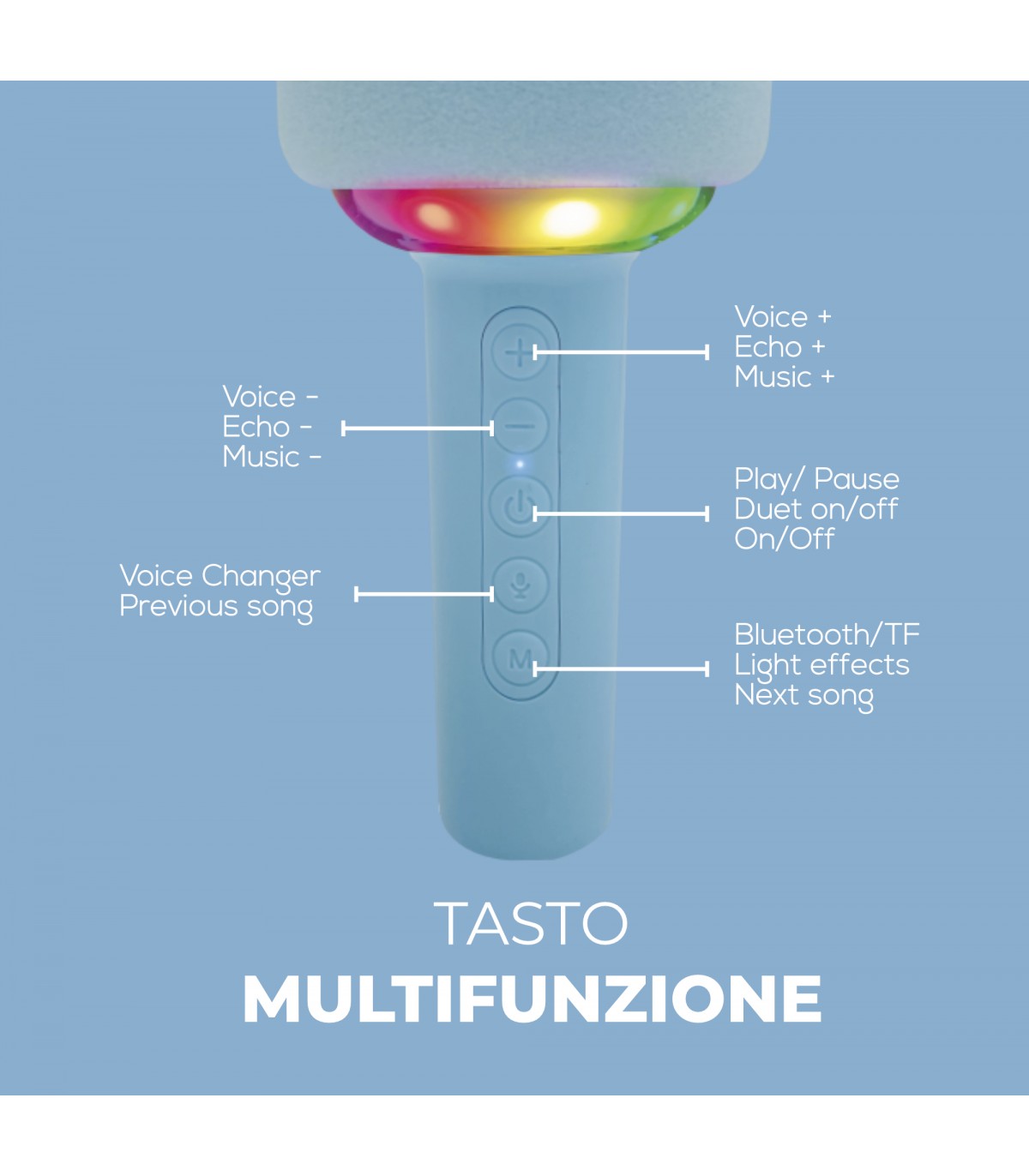 Straordinario microfono in grado di animare le vostre serate tra amici e di divertirvi cantando i vostri brani preferiti. Si collega ad uno smartphone o tablet tramite bluetooth per ricevere la musica tramite le app preferite. Basterà poi cantare normalmente e la propria voce verrà miscelata alla musica e amplificata dal microfono stesso. Alcuni tasti posti sul microfono consentono di regolare il livello di volume, eco, scegliere l'effetto luce desiderato o spegnerlo. E' presente persino un voice-changer che modificherà la vostra voce in tempo reale con effetti esilaranti. Sul fondo dell'impugnatura sono presenti, oltre ad uno slot per microSD, una presa cuffia e una presa USB di tipo-C, sia per la ricarica della batteria interna sia per il collegamento a smartphone compatibili ai quali verrà inviato il segnale audio per poterlo ad esempio registrare tramite app specifiche. Che siate soli o in compagnia questo microfono vi stupirà rendendo straordinaria la più noiosa delle serate.
