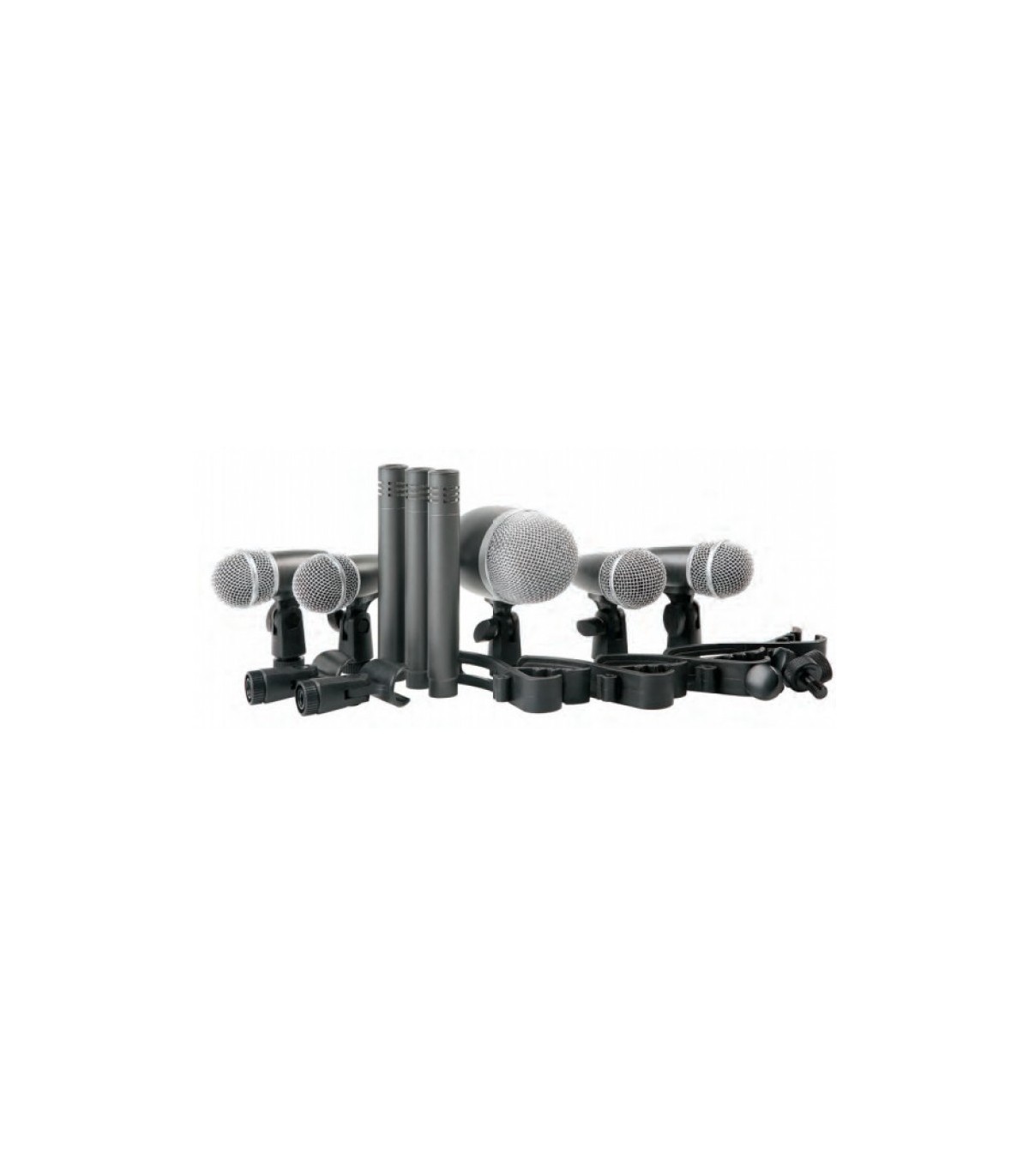 Set completo di microfoni per amplificare la batteria, composto da un microfono per la ripresa della cassa, quattro microfoni per tom e rullante, tre per piatti e charleston. I microfoni sono dotati dei relativi supporti a clip per il fissaggio. Il kit comprende anche una robusta valigetta per il trasporto