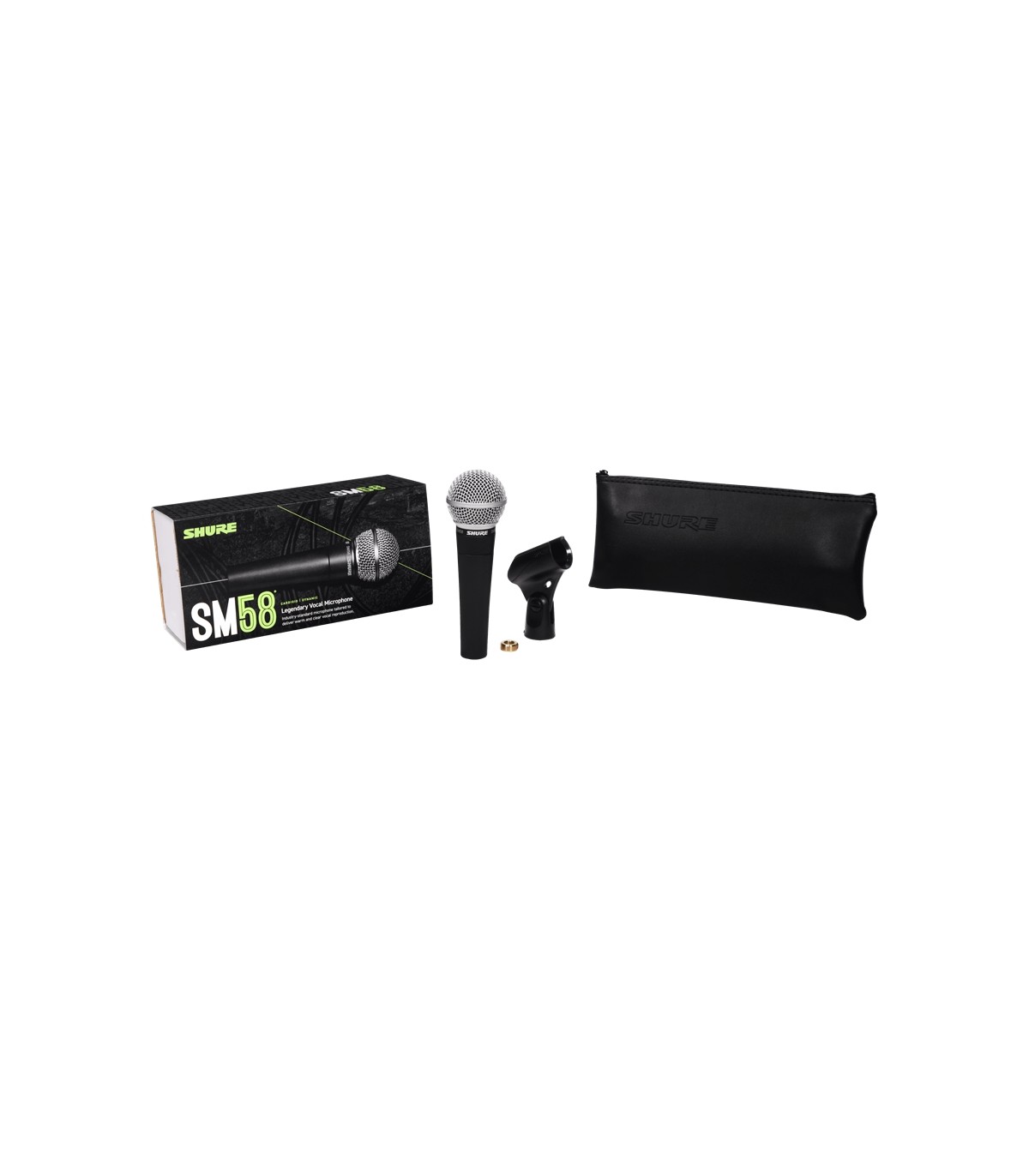 Il modello SM58 della Shure è un microfono dinamico unidirezionale (Cardioide) per applicazioni vocali realizzato per l'utilizzo in studi di registrazione ed impianti di amplificazione professionali. Un filtro sferico incorporato molto efficace riduce al minimo il rumore del vento e l'effeto pop. Il diagramma polare Cardioide isola la sorgente sonora principale e simultaneamente riduce al minimo il rumore di fondo indesiderato. Il microfono SM58 presenta una risposta vocale ottimizzata per fornire un suono la cui qualità costituisce uno standard mondiale. La robustezza della fabbricazione, il comprovato sistema di supporto antivibrazione e la griglia in acciaio inossidabile ne garantiscono la costanza delle prestazioni, anche quando lo si maneggia senza delicatezza. Sia all'aperto che in interni, per canto o parlato l'SM58 è il microfono scelto dai professionisti in tutto il mondo.