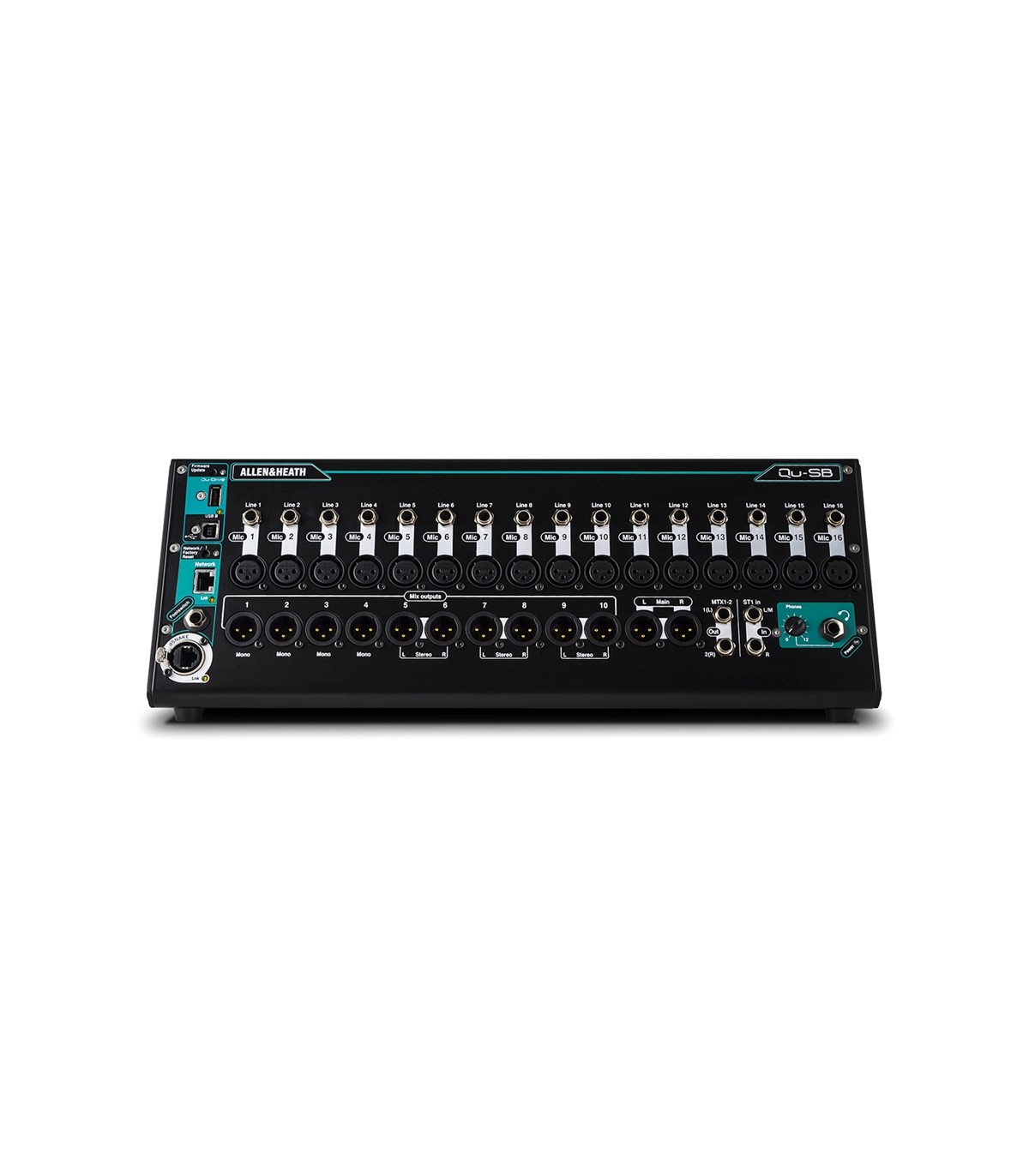 L’Allen & Heath Qu-SB è un mixer digitale con 18 ingressi e 14 output. La SuperStrip di ogni singolo canale è sostituita in questo modello dai controlli touchscreen su app iOS per iPad che ci offre la stessa possibilità di agire su preamp, filtro passa alte, Eq parametrico, GEQ, gate, compressore e Pan della versione con comandi on-board. 4 processori di effetti sono configurabili in insert o in mandata da canale o mix bus. Allen & Heath Qu-SB integra un’interfaccia audio USB 32 In/32 Out per registrazione multitraccia su memorie di massa USB o l’utilizzo integrato con software DAW. Tramite app QU-Pad (iOS) è possibile salvare e richiamare scene e preset nel mixer.