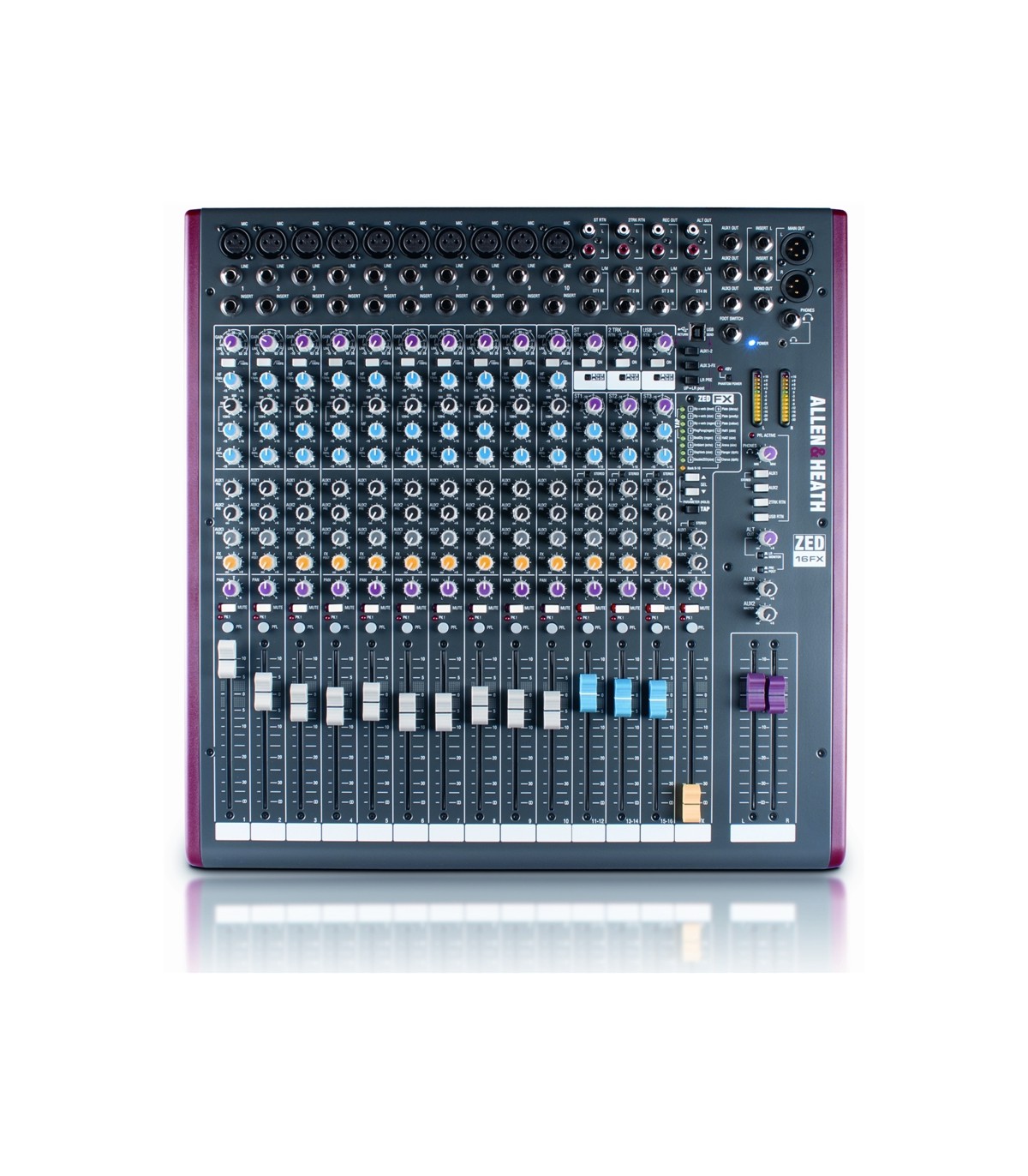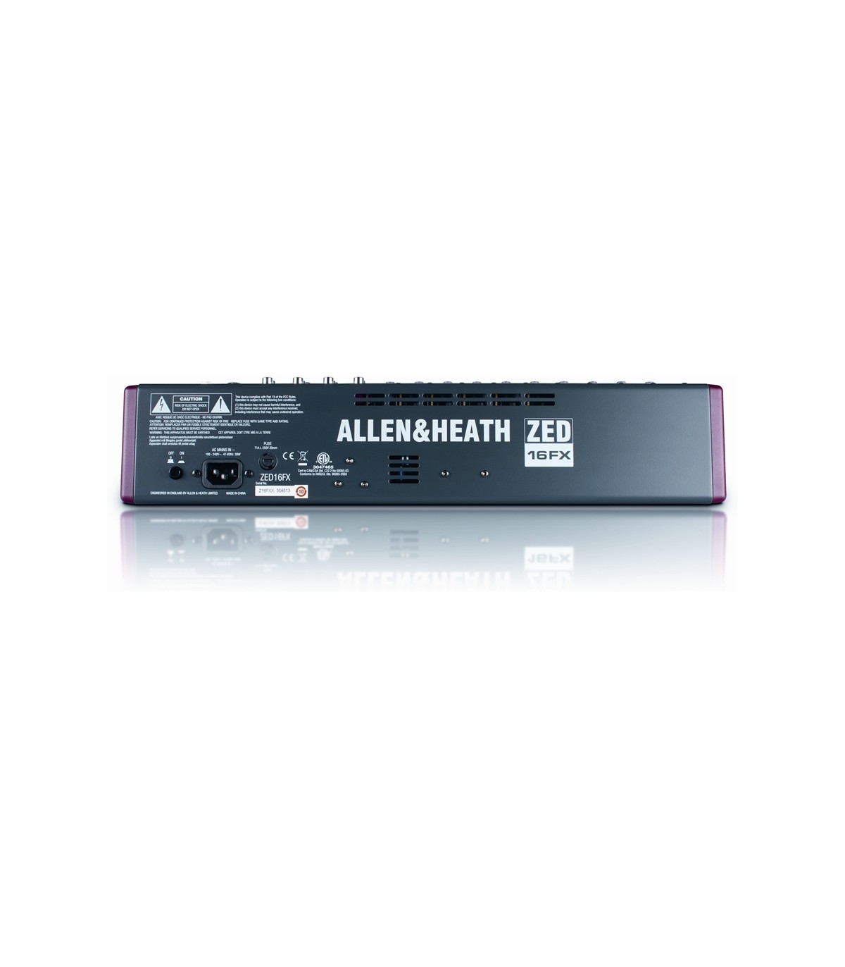 ZED-16FX offre inoltre un processore di effetti con Tap tempo delay, conversione 24 bit/48kHz, ed un set di 16 effetti derivati direttamente dai sistemi Allen&heath iLive.