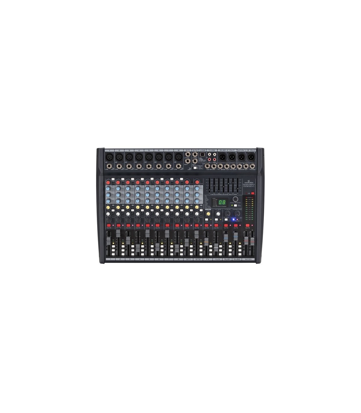 2 Mandate AUX (1 con selezione Pre/Post per l’effetto interno o l’uscita AUX1; 1 Pre-Fader per l’uscita AUX2) con livello sul canale e master, AFL, e uscite Jack da 63mm