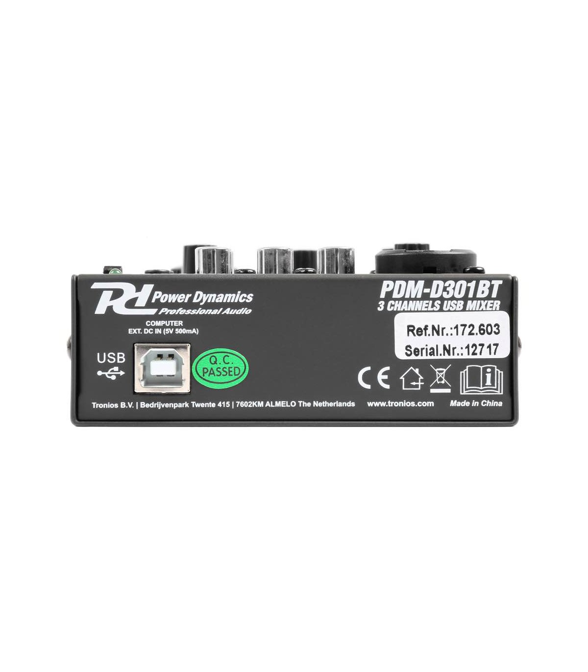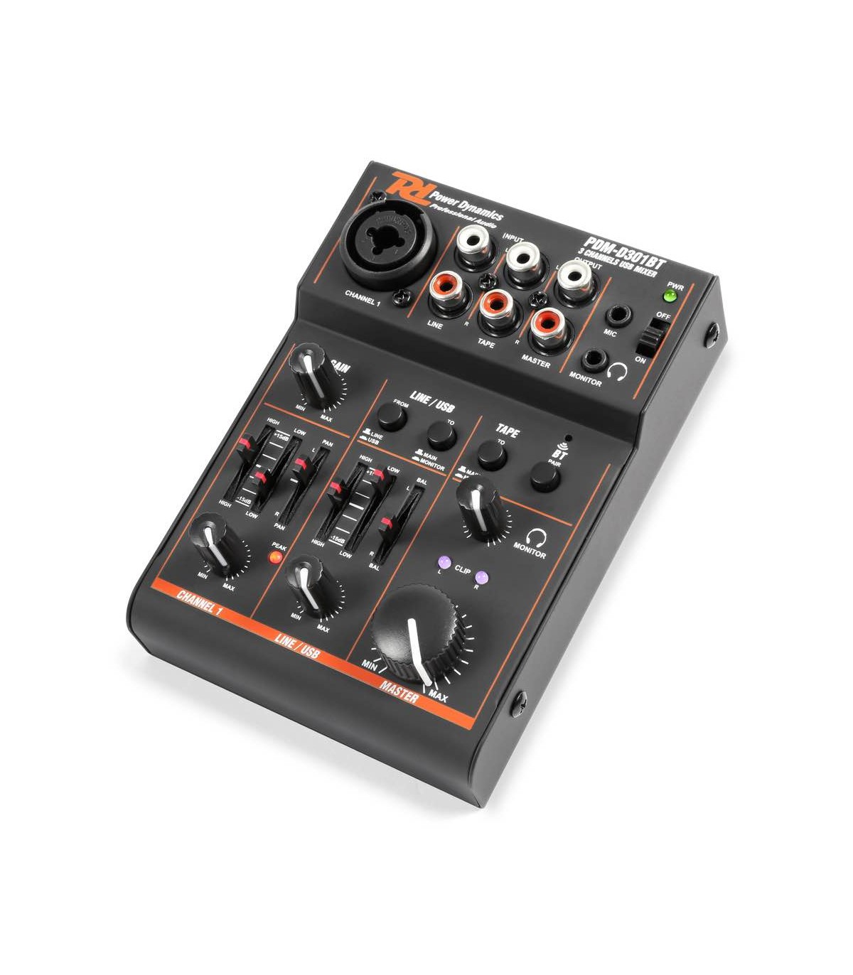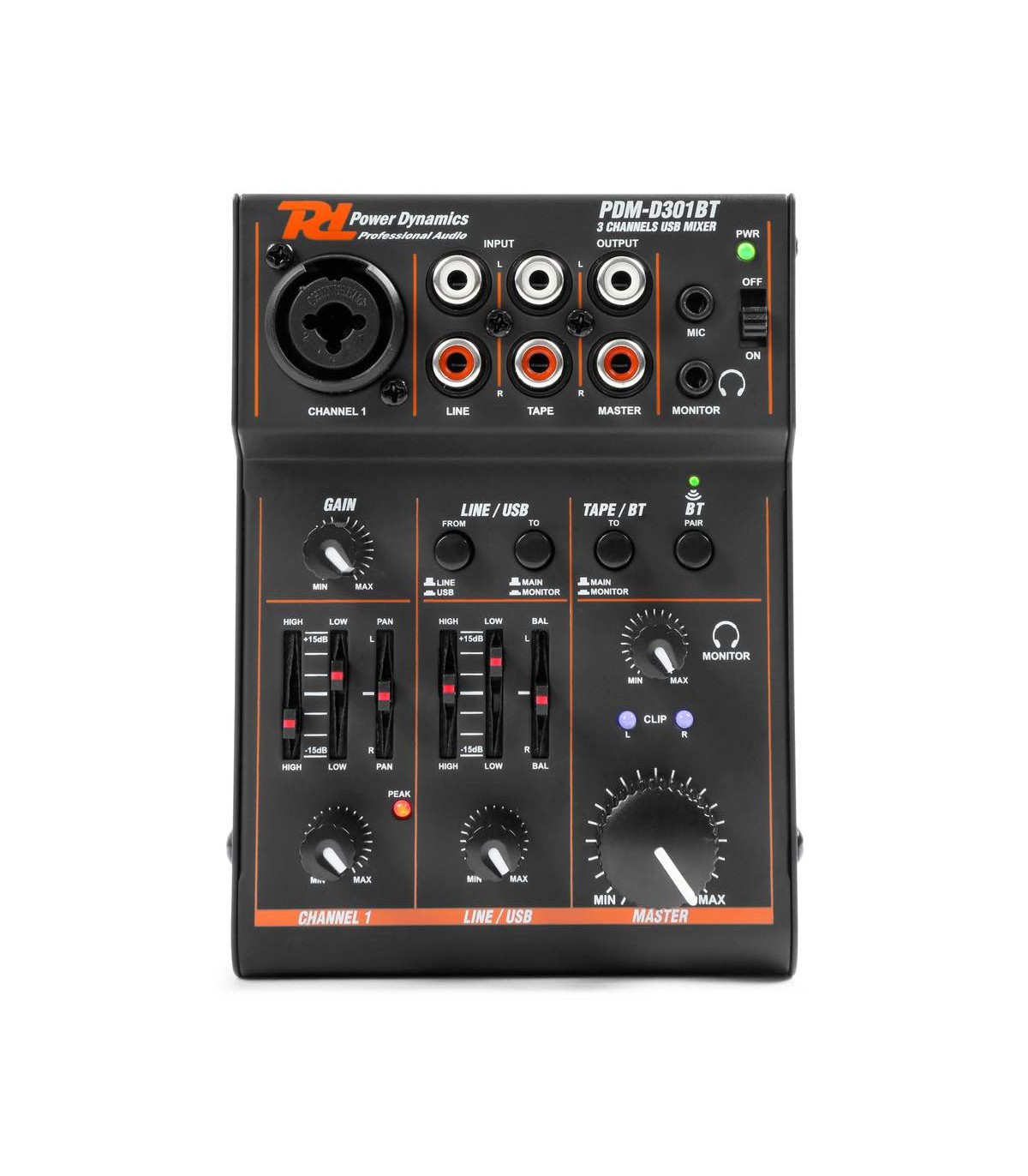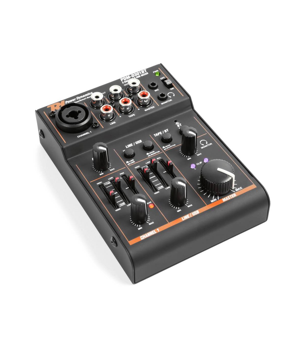 Nessun dispositivo delle dimensioni del mixer USB PDM-D301 a 3 canali con scheda audio è in grado di offrire le sue stesse funzionalità, cosa che lo rende unico nel suo genere. Il ricevitore BT nel mixer audio consentirà la riproduzione di audio in streaming. Il mixer è dotato di 1 canale di ingresso mono e 1 canale di ingresso stereo, entrambi dotati di equalizzatore a 2 vie per il controllo degli alti e dei bassi. Inoltre, il mixer è dotato di ingressi track assegnabili al mix principale. La scheda audio USB integrata fornisce inoltre l'alimentazione per il mixer.