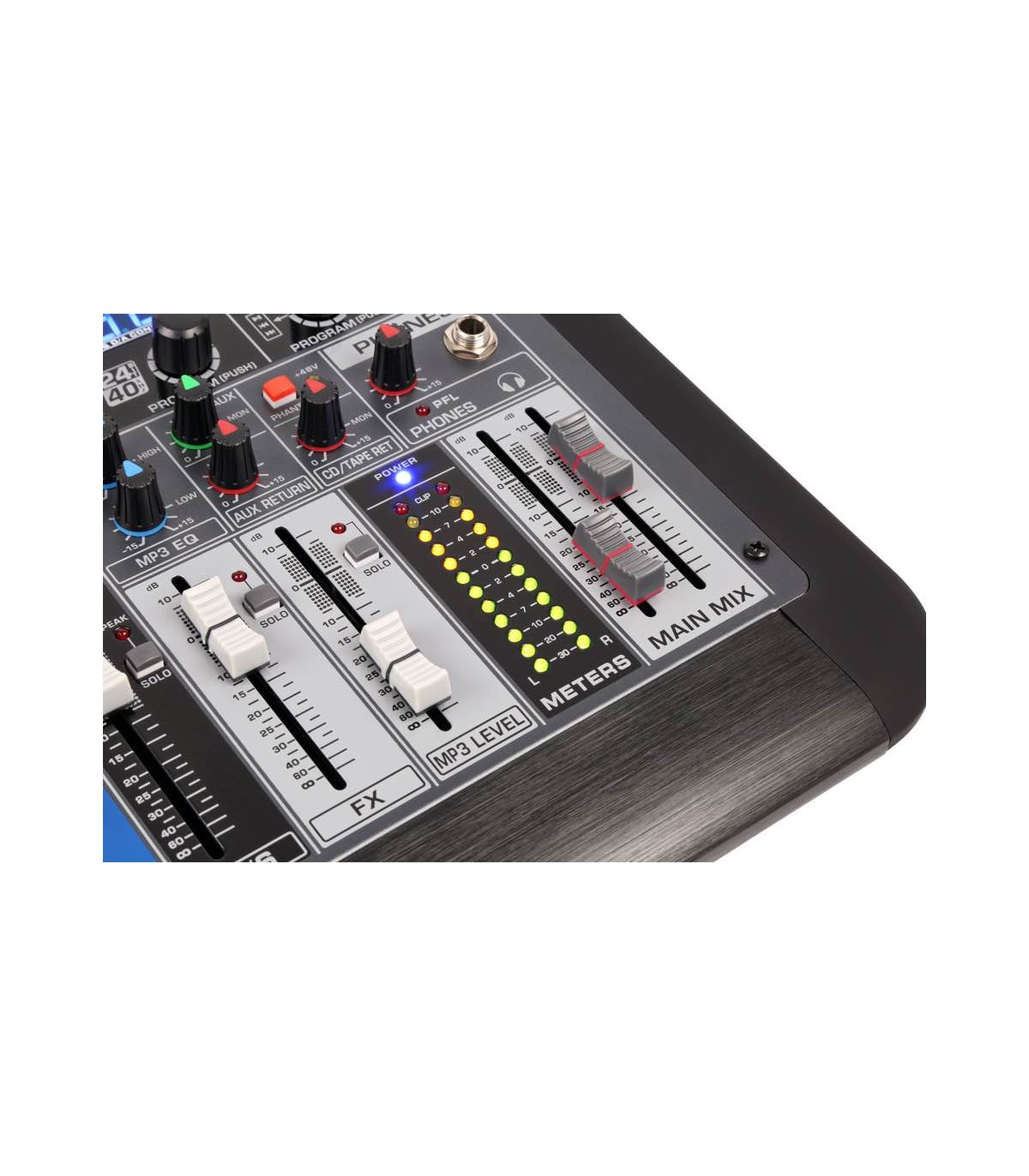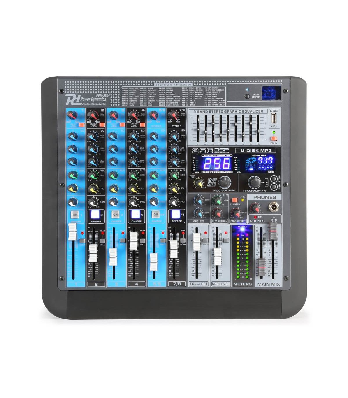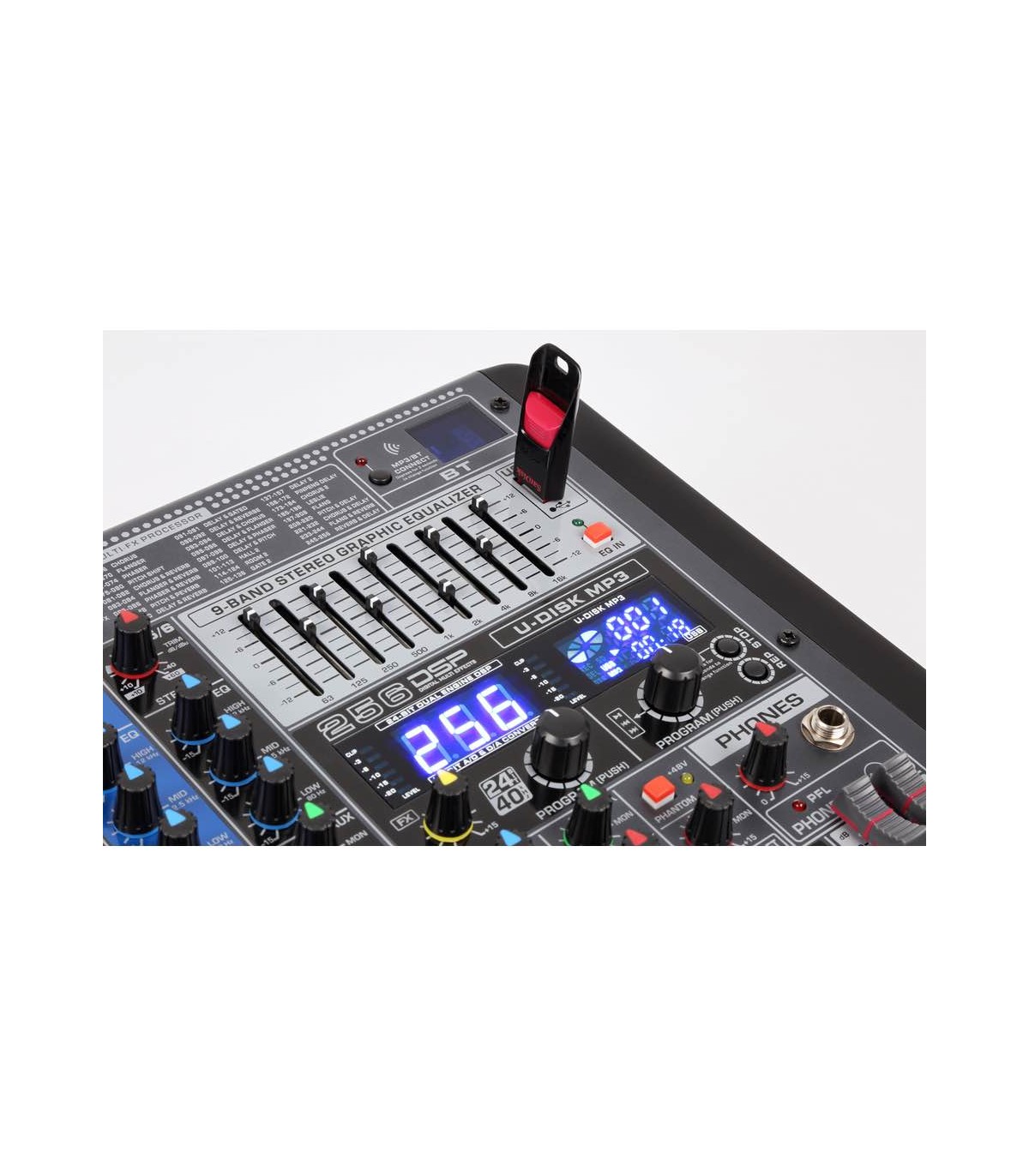 Mixer professionale a 8 canali dotato di lettore USB integrato e ricevitore BT. Perfetto per l'uso durante esibizioni dal vivo, luoghi di culto o altri luoghi che richiedono ingressi multipli.