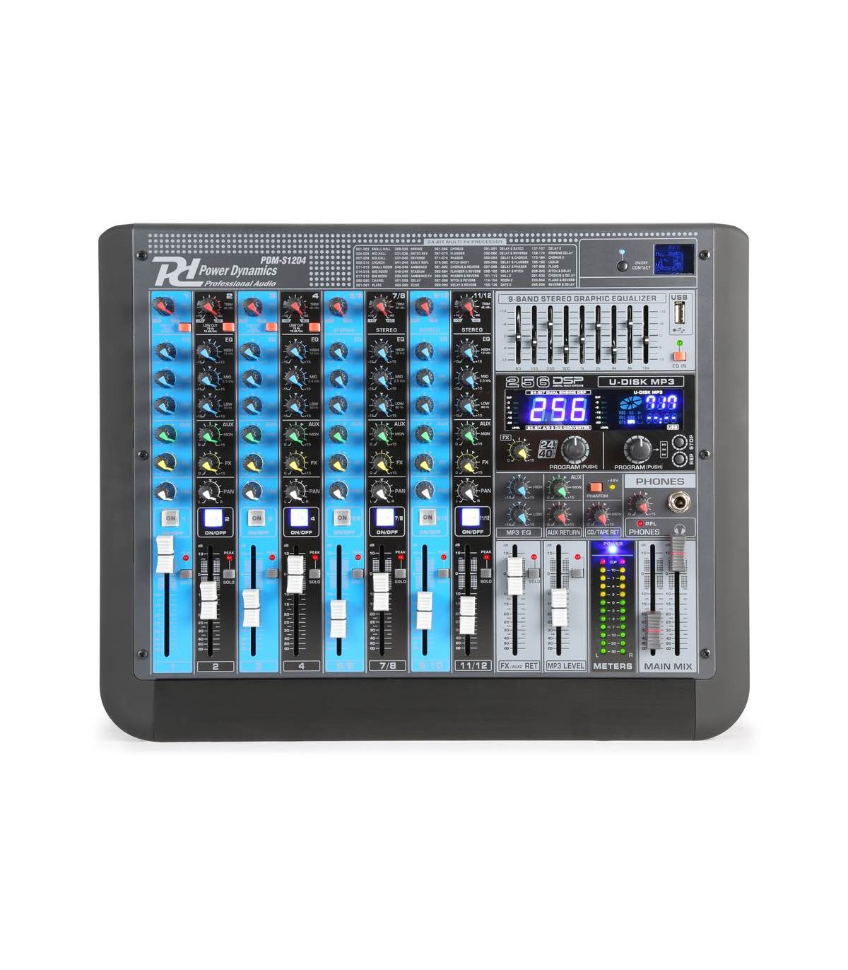 Mixer professionale a 12 canali dotato di lettore USB integrato e ricevitore BT. Perfetto per l'uso durante esibizioni dal vivo, luoghi di culto o altri luoghi che richiedono ingressi multipli.