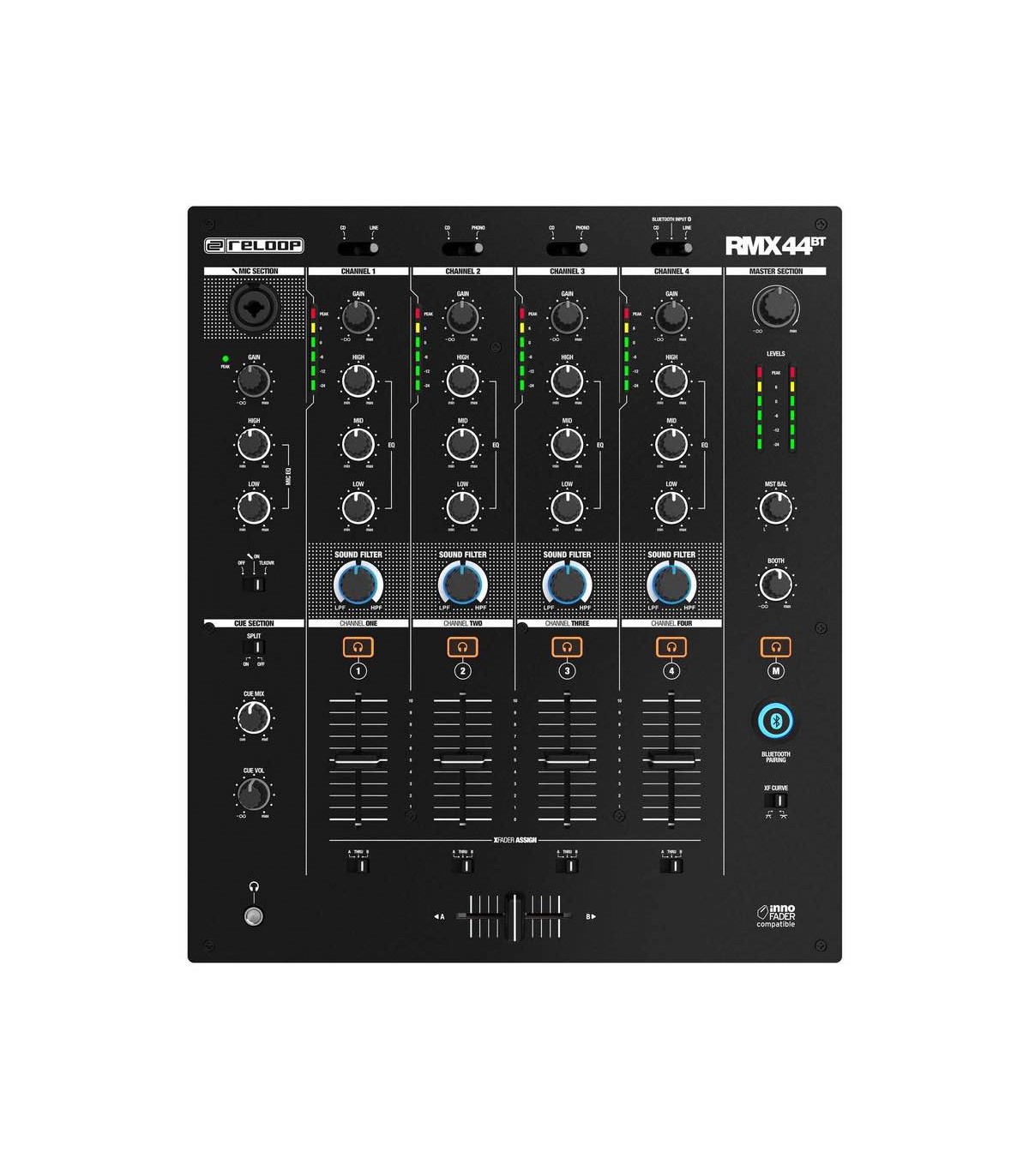Mixer professionale per DJ a 4+1 canali con Bluetooth integrato, doppio filtro ed EQ a 3 bande per i canali 1-4, canale Mic con EQ a 2 bande e talkover, interruttore mono/stereo per uscita cuffie, crossfader con curva regolabile, 6 ingressi Line, 2 Phono, 1 Bluetooth, 1 Mic (Combo), uscite Master (XLR e RCA), Rec (RCA) e Booth (RCA), cuffie (jack da 6,3 mm). Dimensioni 320 x 379.4 x 106.4 mm, peso 5,4 Kg.